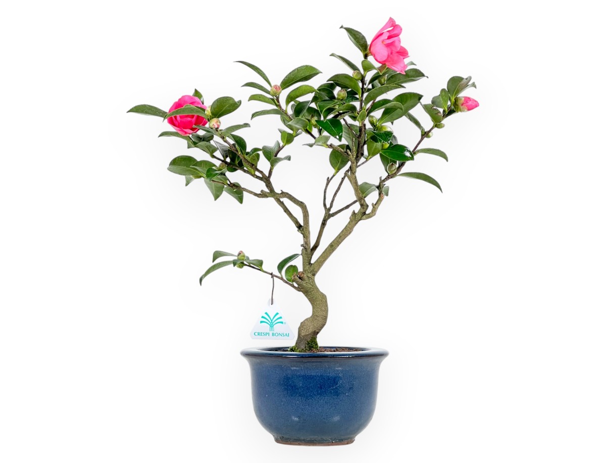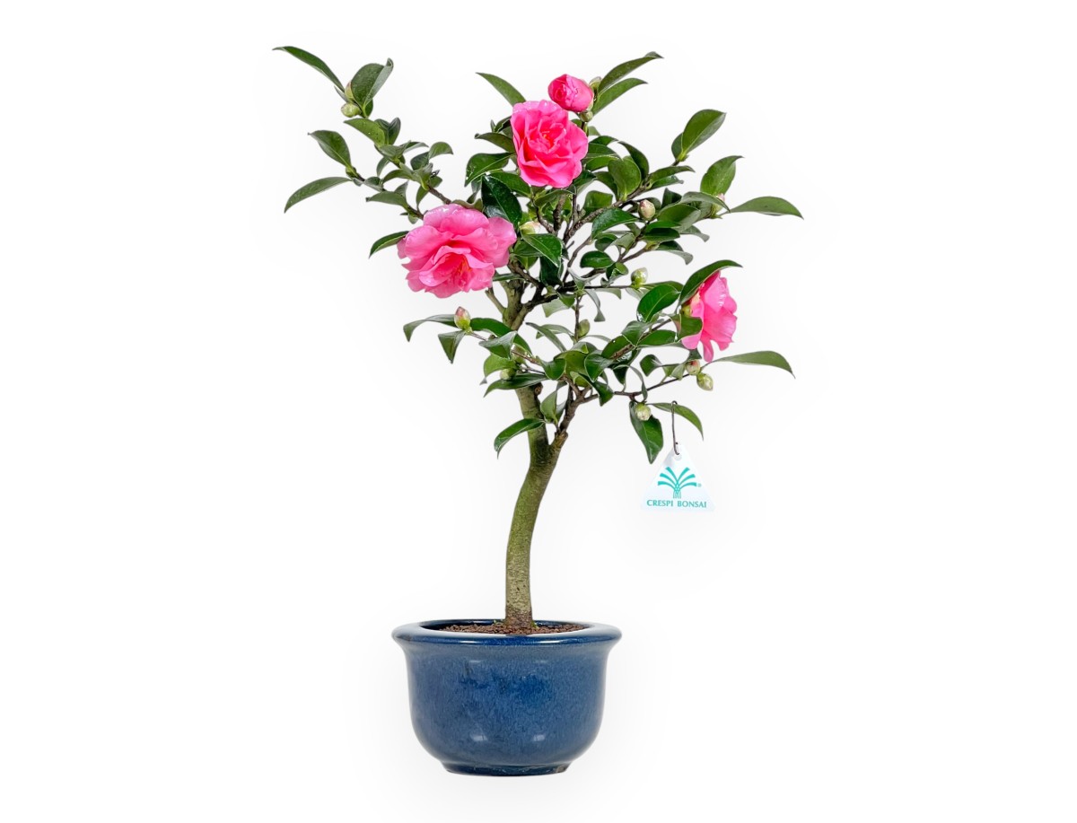 Flower bonsai, in round blue glazed stoneware pot