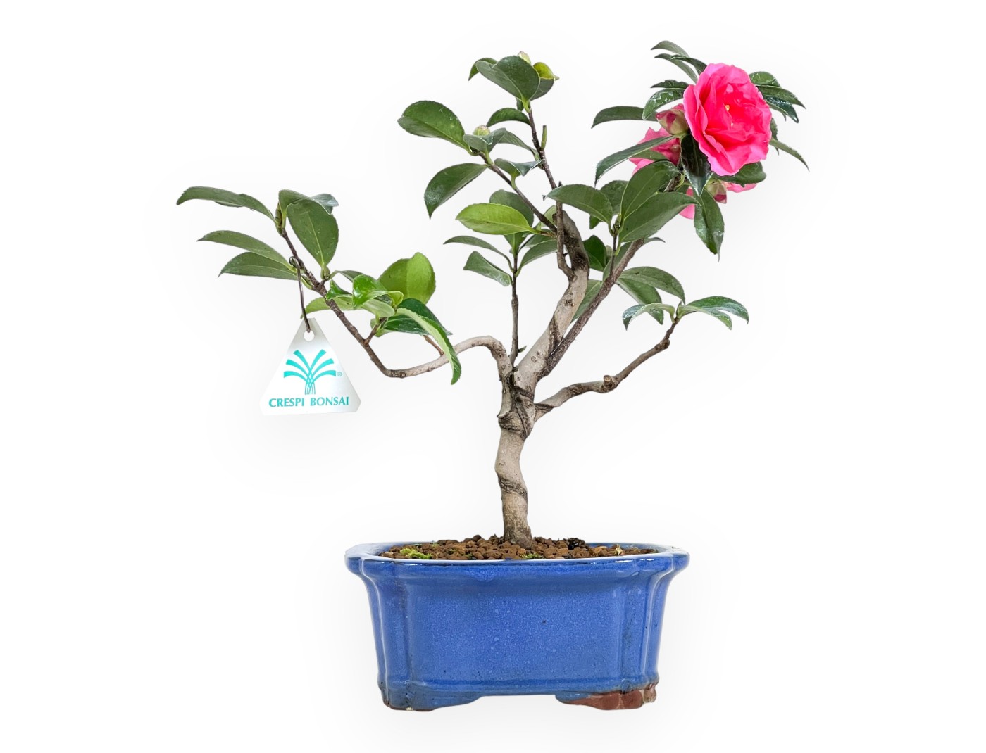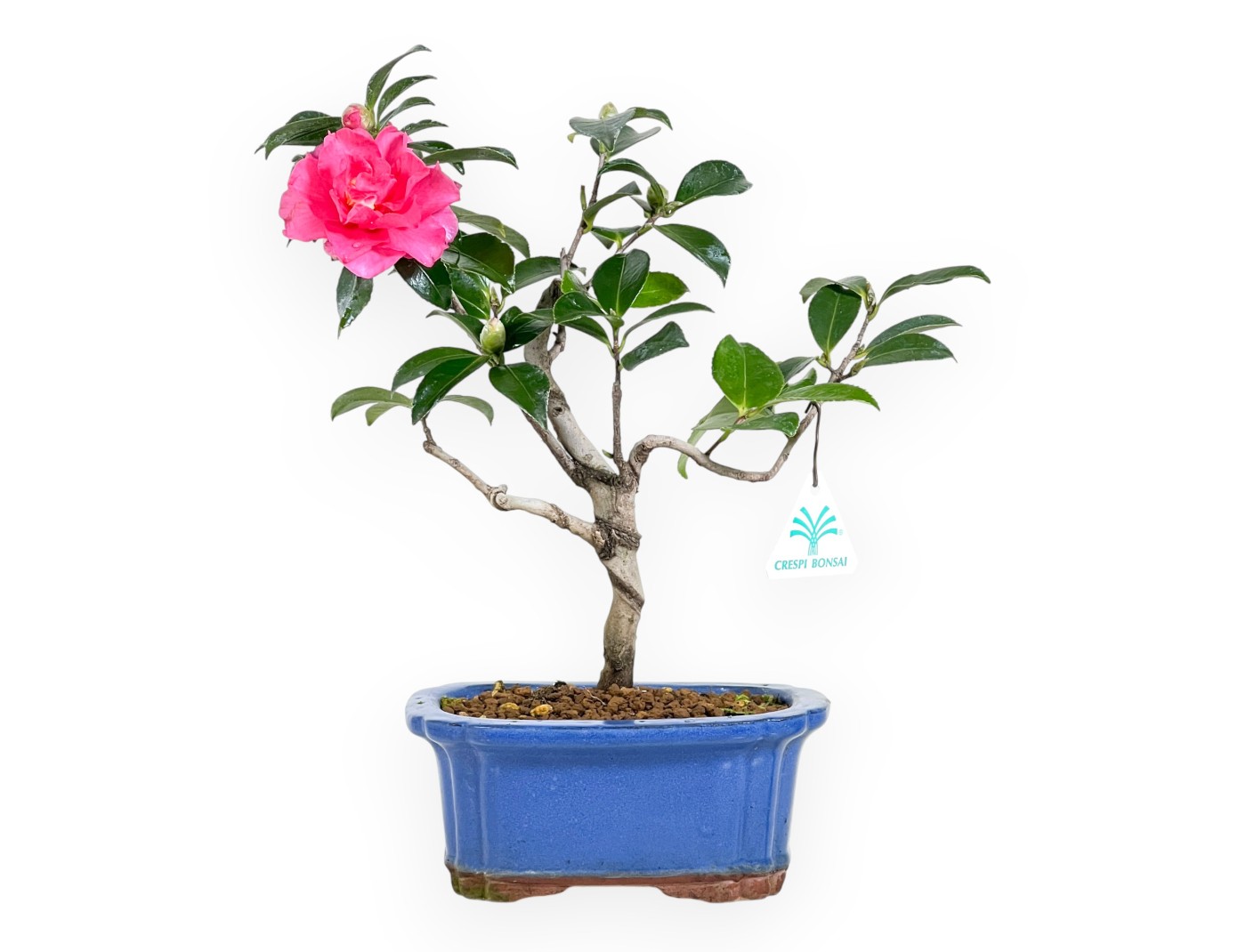 This bonsai of Camellia japonica (camelia) belonging to the evergreen flowering variety, is prized for its pink spring and autumn flowers. The rectangular blue glazed stoneware pot with rounded corners, it contrasts elegantly with the shades of the foliage, enhancing its beauty.