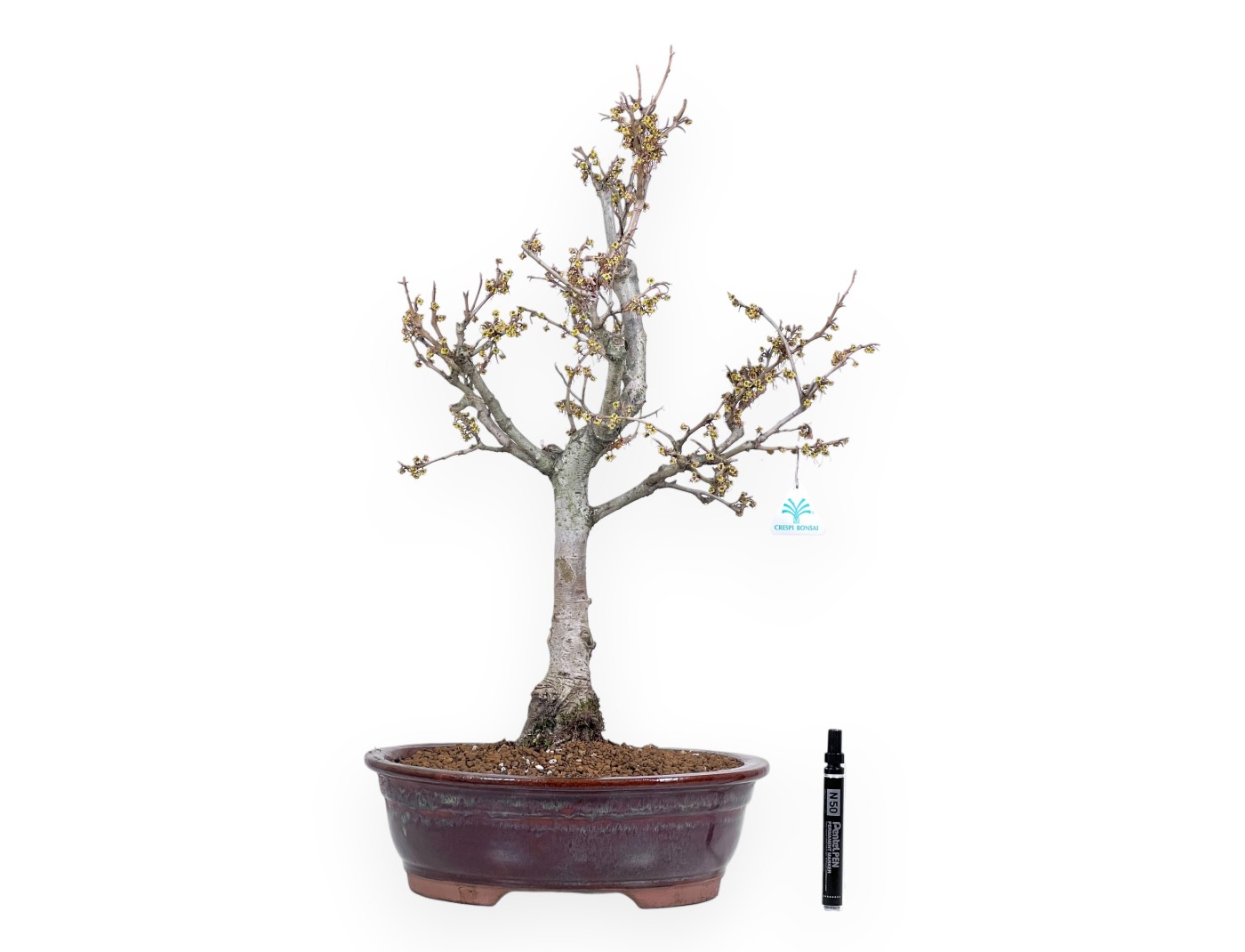 This bonsai of Hamamelis (witch hazel or “witch's shrub”) is a deciduous flowering variety, distinguished by its extraordinary winter blooms. The flowers, with thin, jagged petals, are tinged with yellow, orange, or red and can bloom during the colder months, creating a fascinating contrast with the surrounding environment and making this species unique. The green foliage turns orange-yellow in autumn and sheds its leaves in winter. The oval red glazed stoneware pot, it contrasts elegantly with the shades of foliage and flowers, enhancing its beauty.