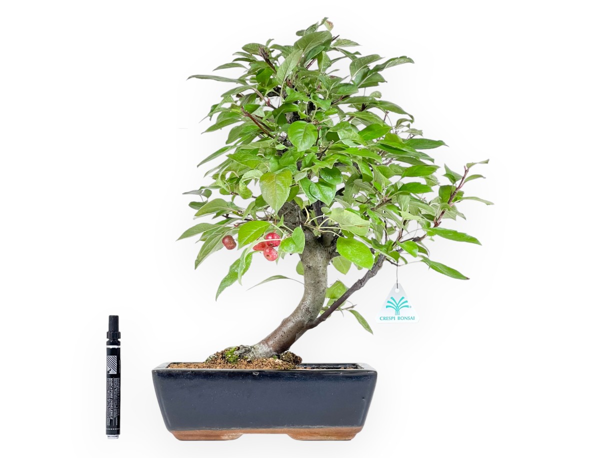 This Malus courtarou coccinella (apple tree) bonsai, belonging to the deciduous fruit variety, is appreciated for its pinkish-white spring blossoms and subsequent production of small apples, which turn from green-yellow to red when ripe, giving character to the tree. The foliage turns orange-yellow in autumn and sheds in winter. The rectangular blue glazed stoneware pot contrasts elegantly with the intense green of the foliage. The sinuous trunk lends naturalness and balance.