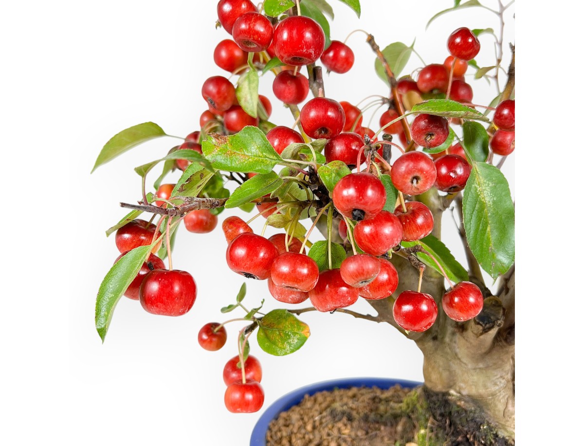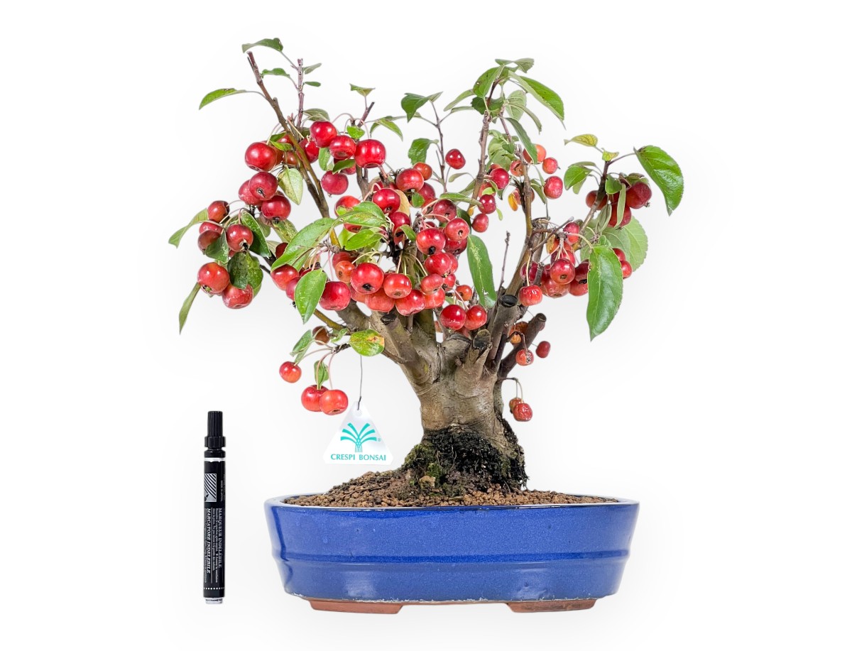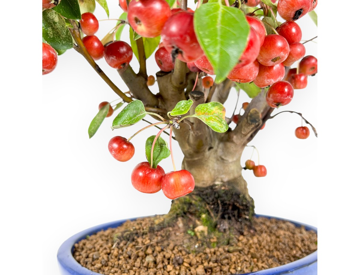 This Malus Evereste (apple tree) bonsai, belonging to the deciduous fruit tree variety, is appreciated for its pinkish-white spring blossoms and subsequent production of small apples, which turn from green-yellow to red when ripe, giving character to the tree. The foliage turns orange-yellow in autumn and sheds in winter. The oval blue glazed stoneware pot contrasts elegantly with the intense green of the foliage. Cultivated in a stump style, it has multiple trunks emerging from a single base.