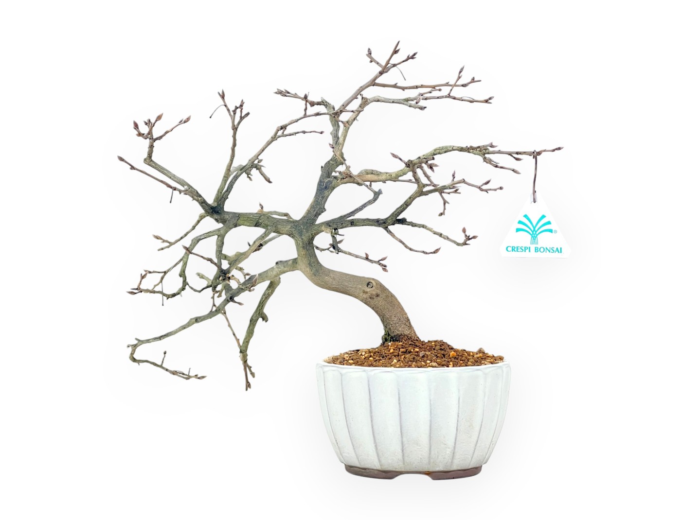 Diospyros kaki (persimmon) deciduous and fruiting bonsai trees, much prized for their distinctive bright orange, ornamental and decorative autumn fruits, which stand out to great effect on bare branches. It produces a delicate cream-coloured blossom in spring, followed in summer by large, glossy, slightly leathery, deep green leaves that turn a beautiful yellow-orange shade in autumn before dropping. It is generally a self-fertile plant, but fruiting may vary depending on growing conditions and pollination. The bare winter structure highlights the elegant, fine, well-distributed branching. It has a sinuous, well-proportioned trunk with harmonious movement and mature bark that conveys solidity and naturalness. The nebari is stable and well set, giving balance and scenic presence to the whole. Cultivated in a cream-coloured glazed stoneware pot, its rounded shape with slight vertical grooves and raised feet, with its soft and elegant lines, enhances the plant's setting and emphasises its refined character, creating a harmonious whole with great aesthetic impact.