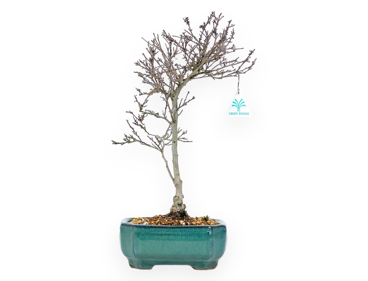 This bonsai of Ilex serrata subtilis (holly) deciduous fruit tree is an ornamental variety prized for its pinkish-white spring flowering and its red or orange berries that ripen in autumn and remain on the plant for most of the winter. The foliage, consisting of small, serrated leaves, sheds its leaves in winter, leaving room for red berries. Cultivated in a turquoise glazed rectangular pot that enhances the intense colours of the foliage. The photo with the foliage full of leaves and berries was taken in September, the one with the bare foliage in February.