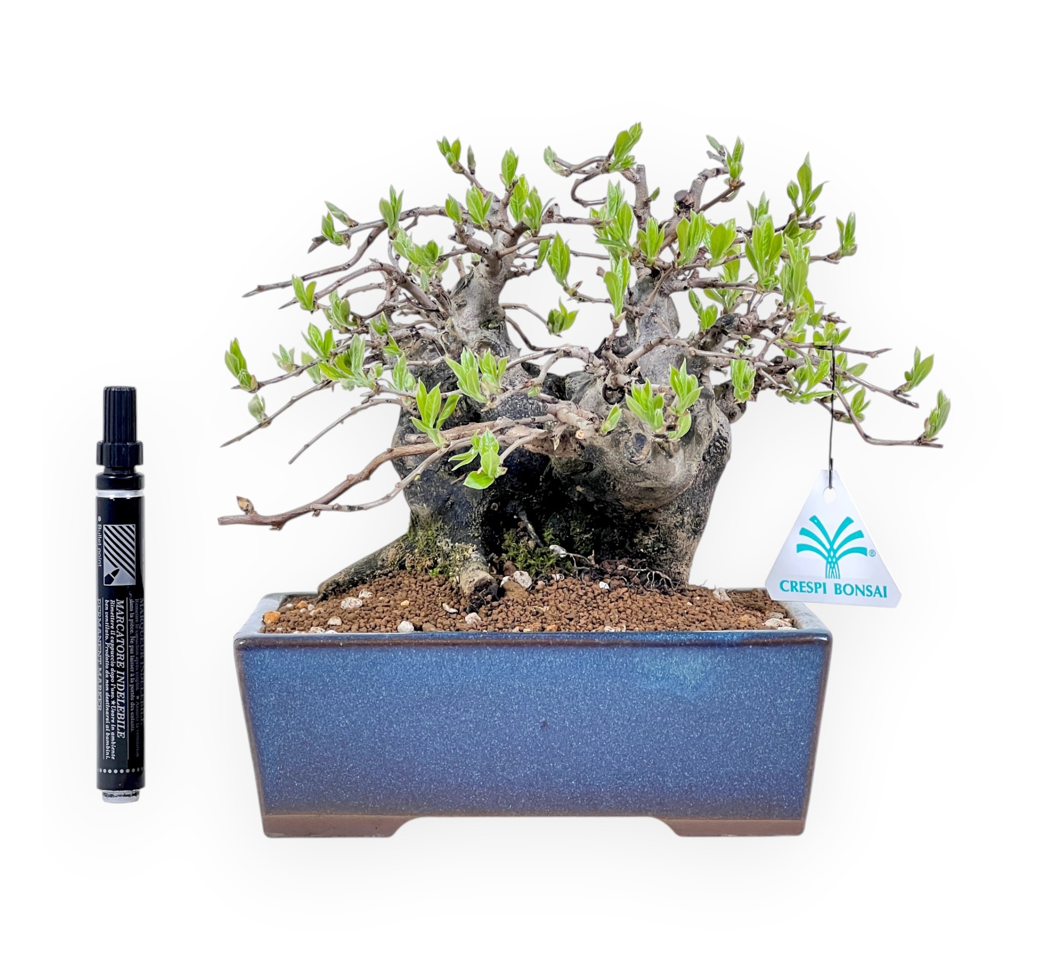 The shohin bonsai of Diospyros kaki (Kaki), belonging to the deciduous fruiting variety, is a variety that is characterized by its hardiness and sweet fruit production. Flowering occurs in late spring with small creamy-yellow flowers, and is followed by ornamental orange autumn fruits. The foliage, consisting of bright green oval leaves, turns orange-yellow in autumn and sheds its leaves in winter. Cultivated in a rectangular blue glazed stoneware pot, which emphasizes the beauty of the bonsai, creating a pleasant contrast with the green leaves.
