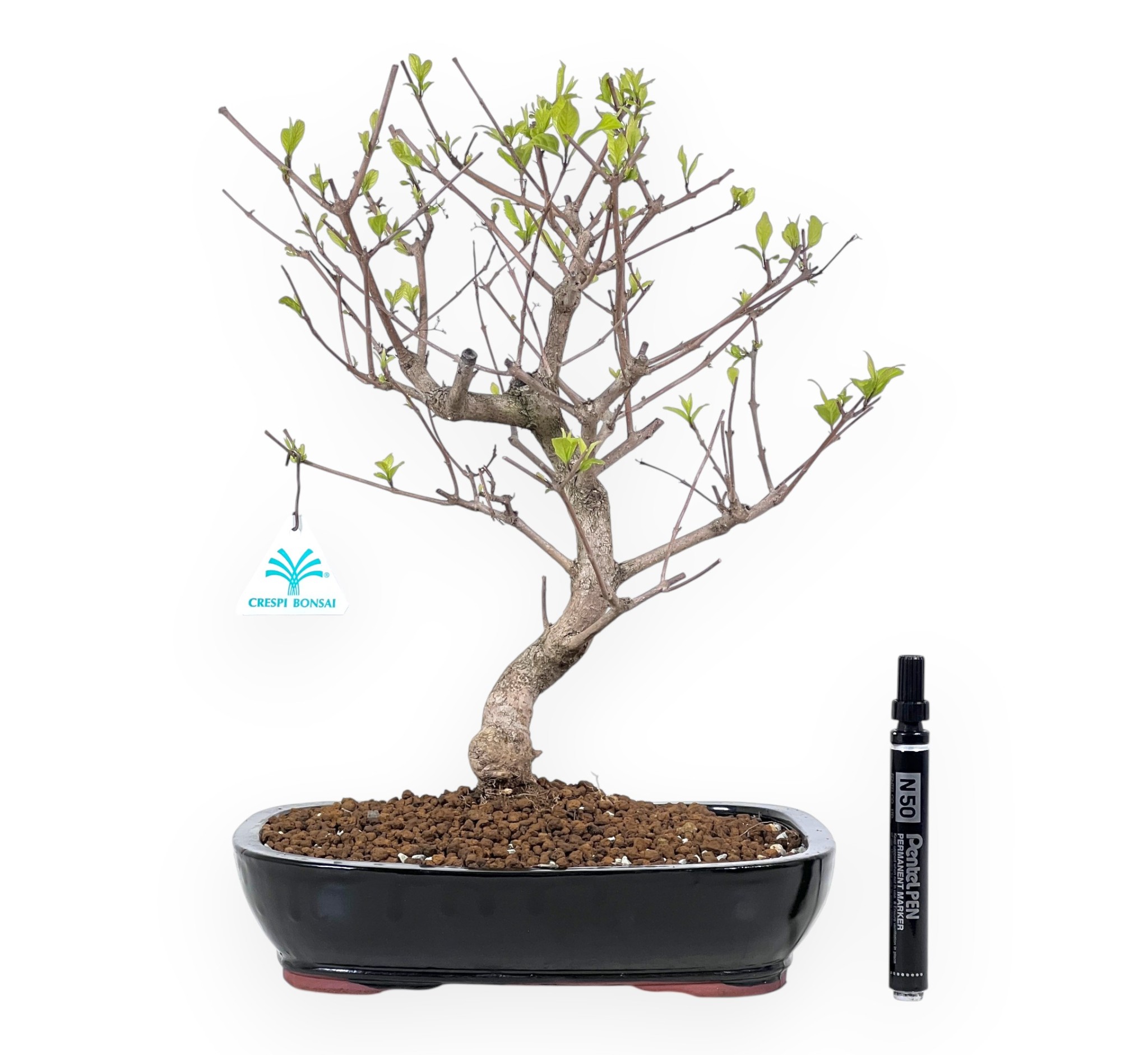 Bonsai of Callicarpa japonica (callicarpa) belonging to the deciduous fruiting variety, is known for its small purple fruits that decorate the branches in autumn, creating a unique ornamental effect. In late spring it produces lilac-pink, four-petalled flowers arranged in clusters at the axils of the leaves. The foliage with light green leaves turns orange-yellow in autumn and sheds its leaves in winter. The rectangular blue glazed stoneware pot, creates a refined contrast with the color of the foliage, elegantly enhancing the composition.