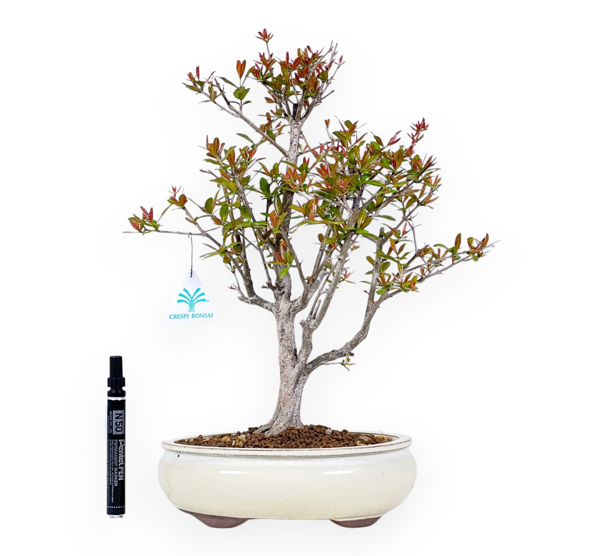 Bonsai of Punica granatum (pomegranate), a deciduous fruit tree, appreciated for its ability to combine elegance, rusticity and seasonal spectacularity. The leaves, small and lanceolate, appear in spring with very decorative red-bronze young shoots that are bright green during the growing season, then take on warm yellow-orange tones in autumn before dropping. During the winter, the plant sheds its leaves completely, emphasising the elegant structure of the trunk and branches. Between late spring and summer, it produces bright orange-red flowers with a characteristic and very ornamental shape. If cultivated under the right conditions, the flowers are followed by fruits, pomegranates, which ripen towards the end of summer-autumn adding further aesthetic value to the plant. Cultivated in an oval cream glazed stoneware pot, contrasts elegantly with the shades of the foliage and flowers, enhancing their beauty.