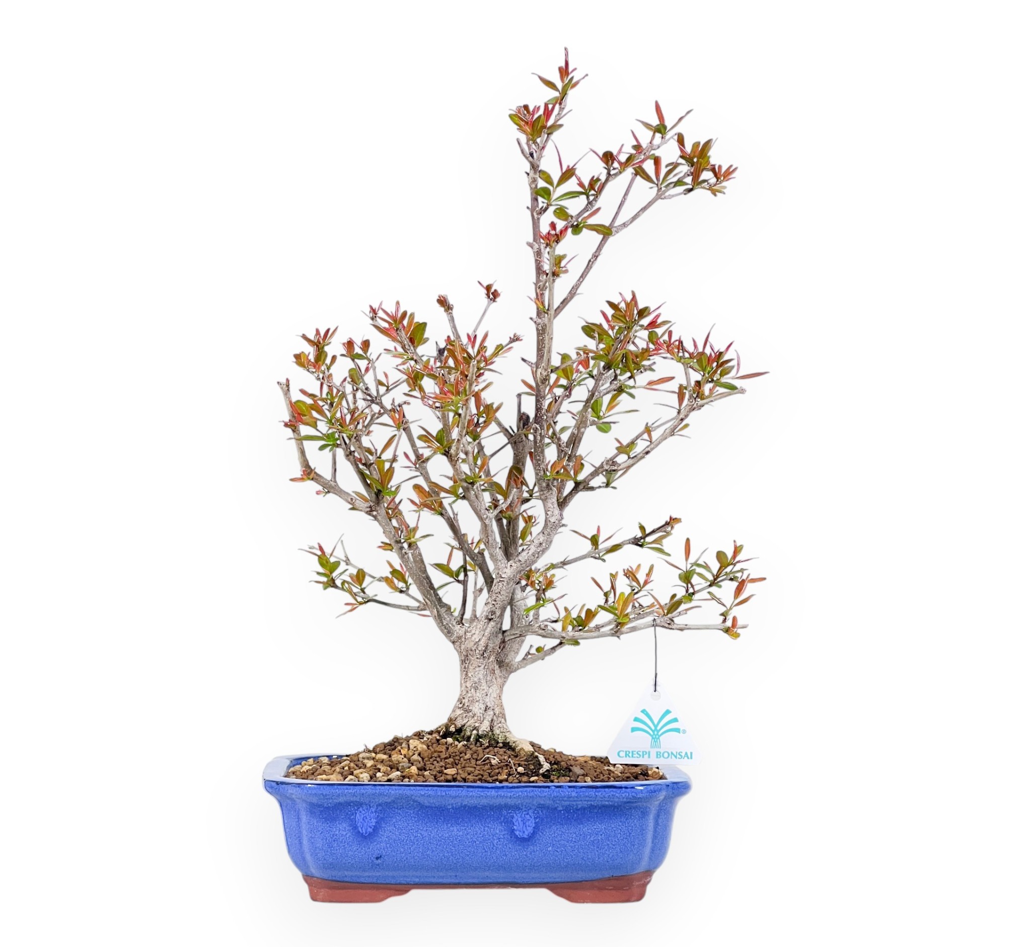 Bonsai of Punica granatum (pomegranate), a deciduous fruit tree, appreciated for its ability to combine elegance, rusticity and seasonal spectacularity. The leaves, small and lanceolate, appear in spring with very decorative red-bronze young shoots that are bright green during the growing season, then take on warm yellow-orange tones in autumn before dropping. During the winter, the plant sheds its leaves completely, emphasising the elegant structure of the trunk and branches. Between late spring and summer, it produces bright orange-red flowers with a characteristic and very ornamental shape. If cultivated under the right conditions, the flowers are followed by fruits, pomegranates, which ripen towards the end of summer-autumn adding further aesthetic value to the plant. Cultivated in a rectangular light blue glazed stoneware pot, creates a refined contrast with the color of the foliage, elegantly enhancing the composition.