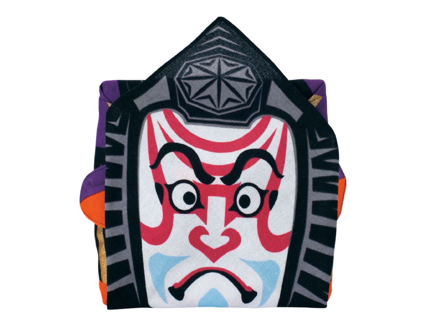 A furoshiki representing the hero of the Edo Kabuki theater, Sukeroku. This play is from the popular Kabuki show, Kanjincho. It is a very interesting motif and by observing it you can perceive a certain comedy (mie). The use of trendy and bold color along with the style, represents Kabuki. It is a unique Japanese aesthetic and different from the popular vision of the Wabi sabi world.