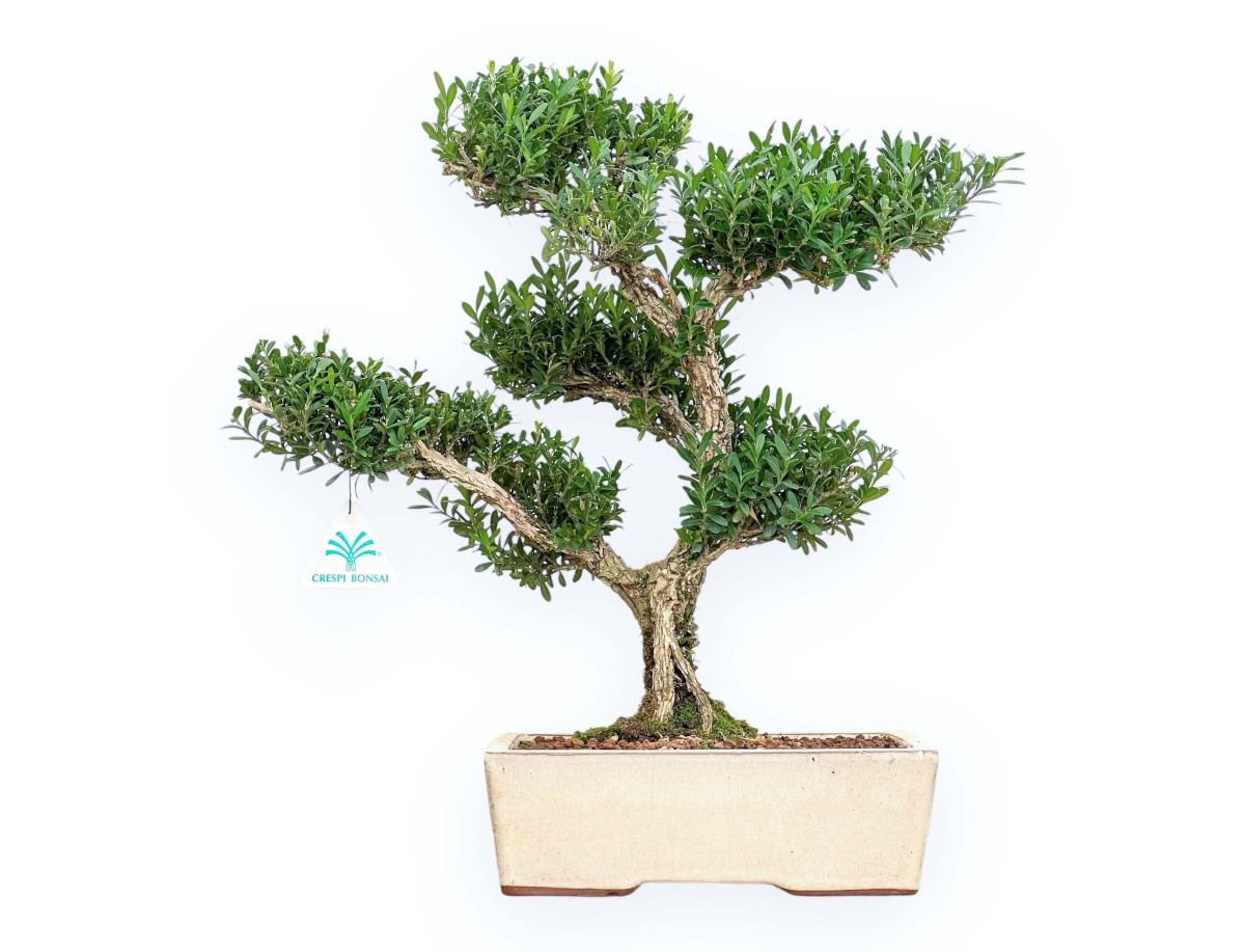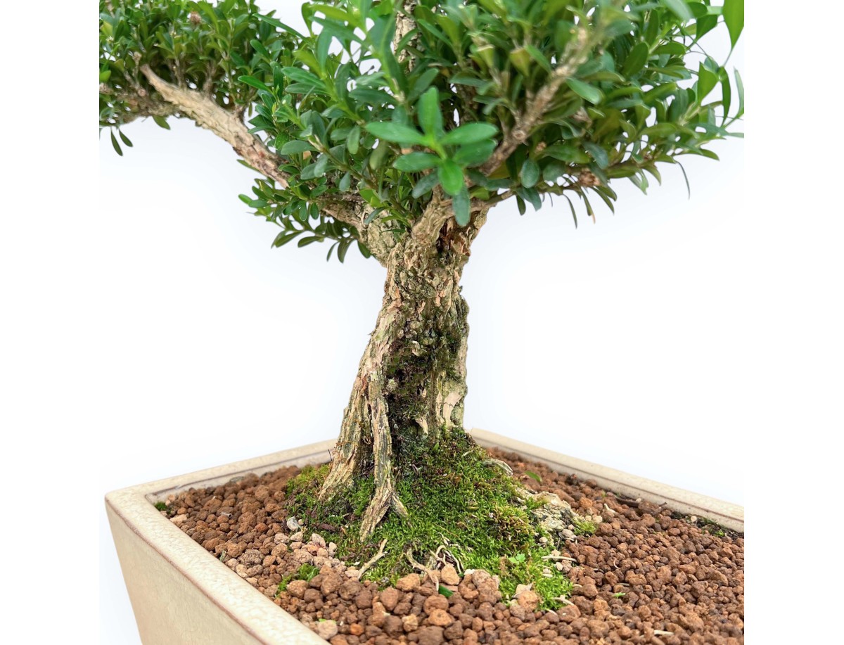 Evergreen bonsai, in rectangular beige glazed stoneware pot