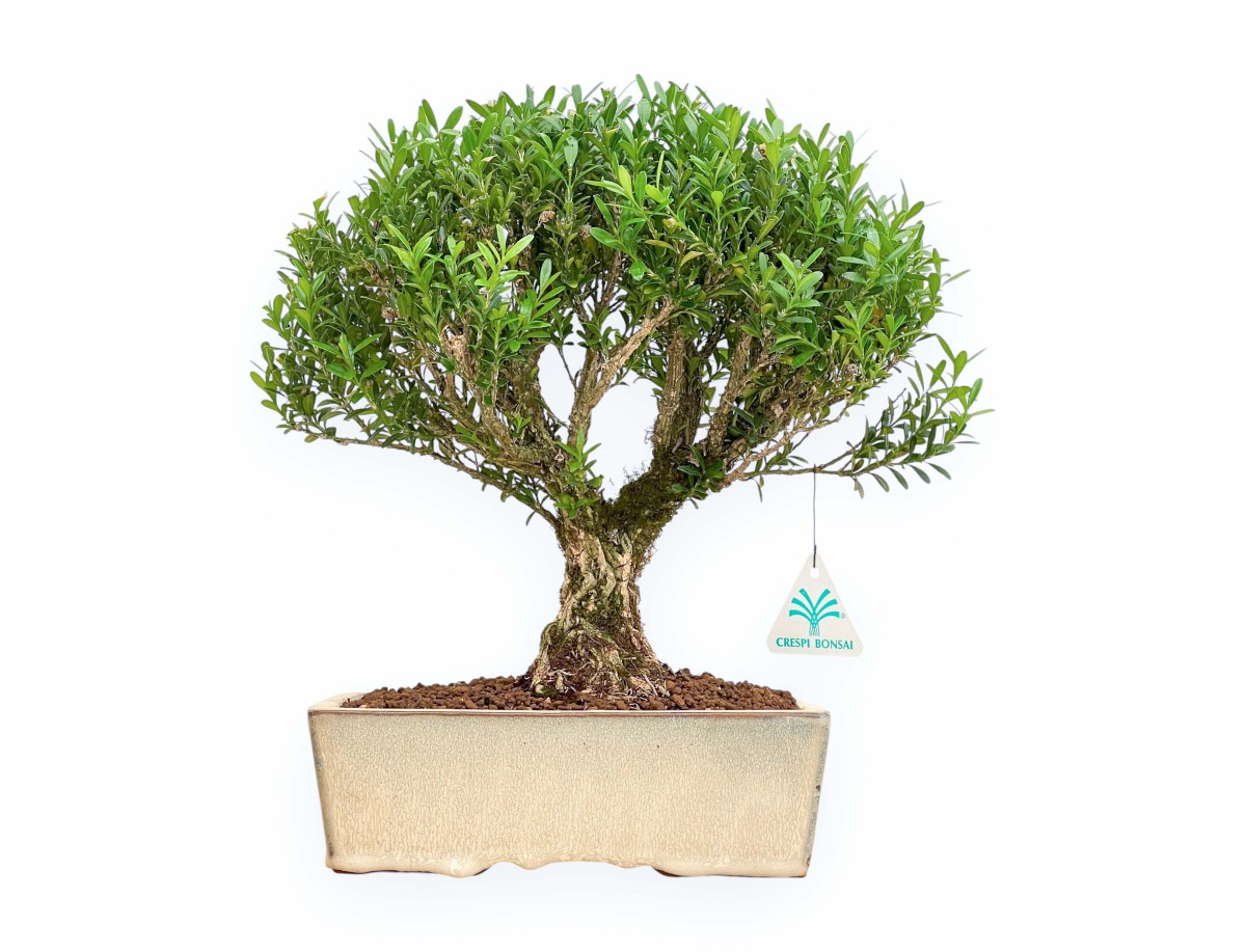 Evergreen bonsai, in rectangular beige glazed stoneware pot