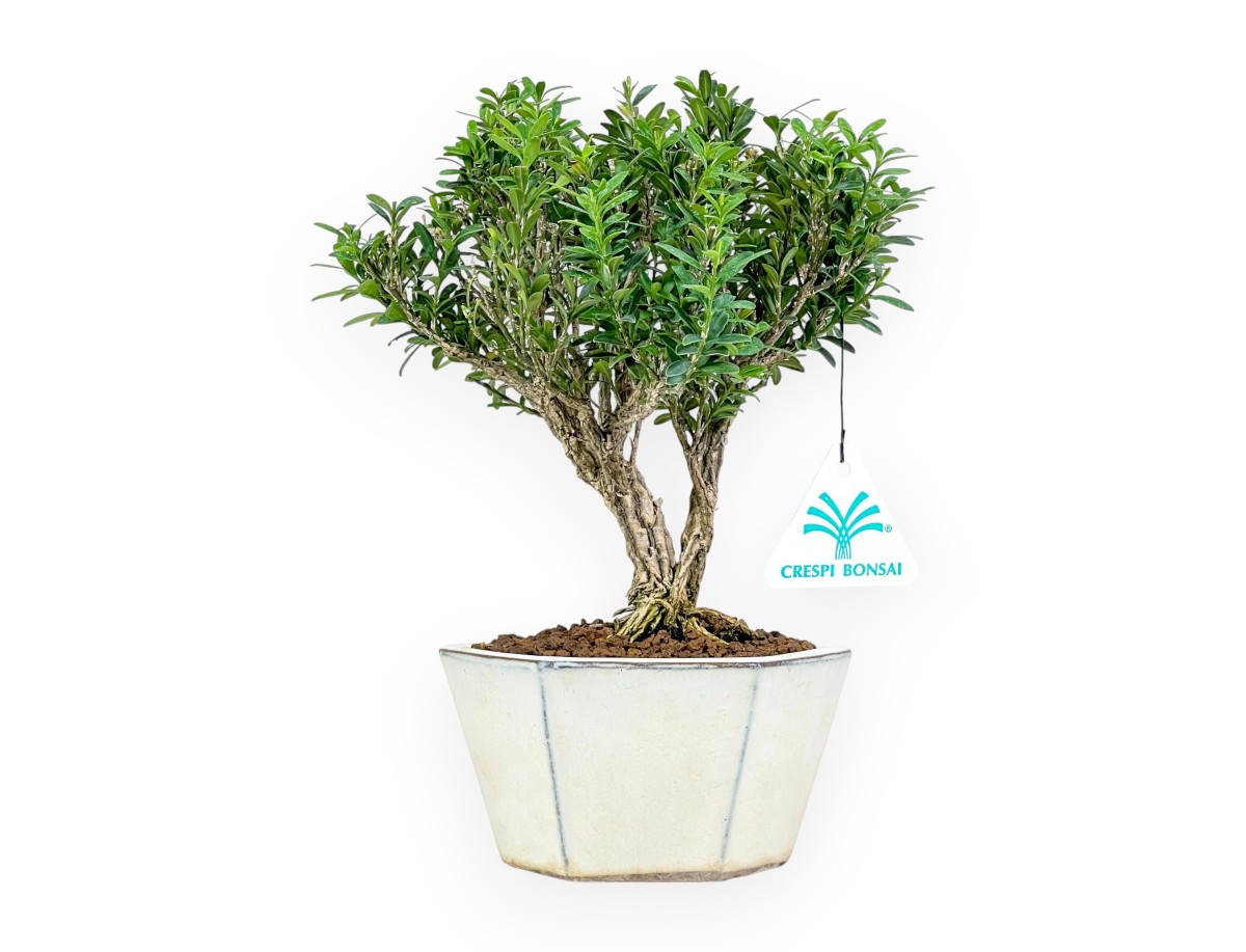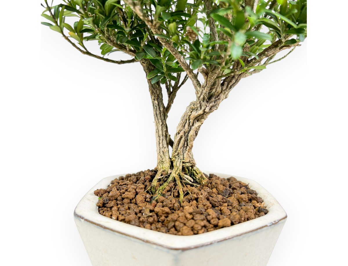 Evergreen bonsai, in hexagonal beige glazed stoneware pot