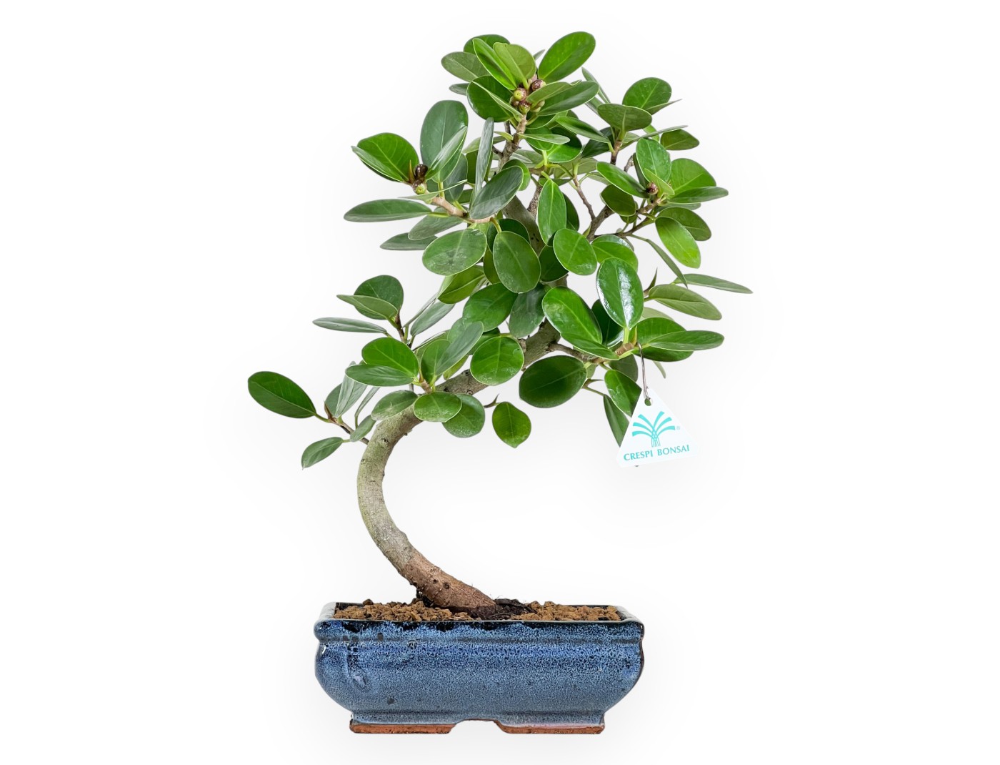This bonsai of Ficus formosanum, belonging to the evergreen indoor variety, is prized for its resistance and rapid growth. It has a dense foliage with deep green oval leaves. Between late spring and summer, but in some cases also in the following months, it can produce green fruits that turn purplish-black as they ripen, which adds to its aesthetic value. Cultivated in a rectangular blue glazed stoneware pot, it creates a striking visual effect.