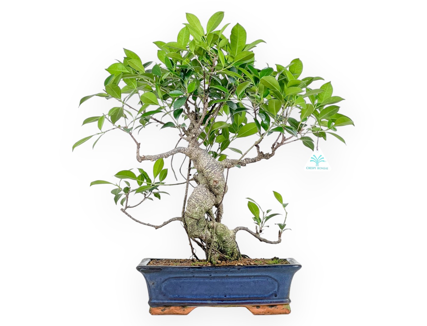 This bonsai of Ficus retusa, belonging to the evergreen indoor variety, is prized for its resistance and rapid growth. It has a dense foliage with deep green oval leaves a sturdy trunk, and well-developed roots. It features an exposed root style (neagari) with a sturdy, well-developed structure, enriched by the aerial roots characteristic of this species, which create a sculptural and dynamic effect, highlighting the beauty of the roots. Cultivated in a rectangular blue glazed stoneware pot, it creates a striking visual effect.