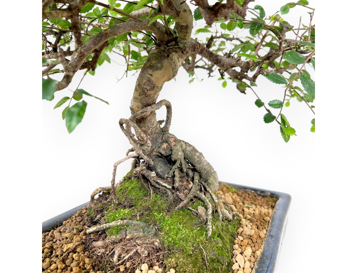 The bonsai of Zelkova nire (Elm) belonging to the evergreen indoor variety and is valued for its hardiness and rapid growth. Characterized by dense foliage with small, deep green, serrated leaves. It has a tiered style, a sturdy and well-developed structure, enriched by exposed roots that make this bonsai distinctive and charming, creating a sculptural effect and highlighting the beauty of the roots. Cultivated in a rectangular blue glazed stoneware pot, it brings out the color of the leaves and perfectly matches the refined look of the bonsai.