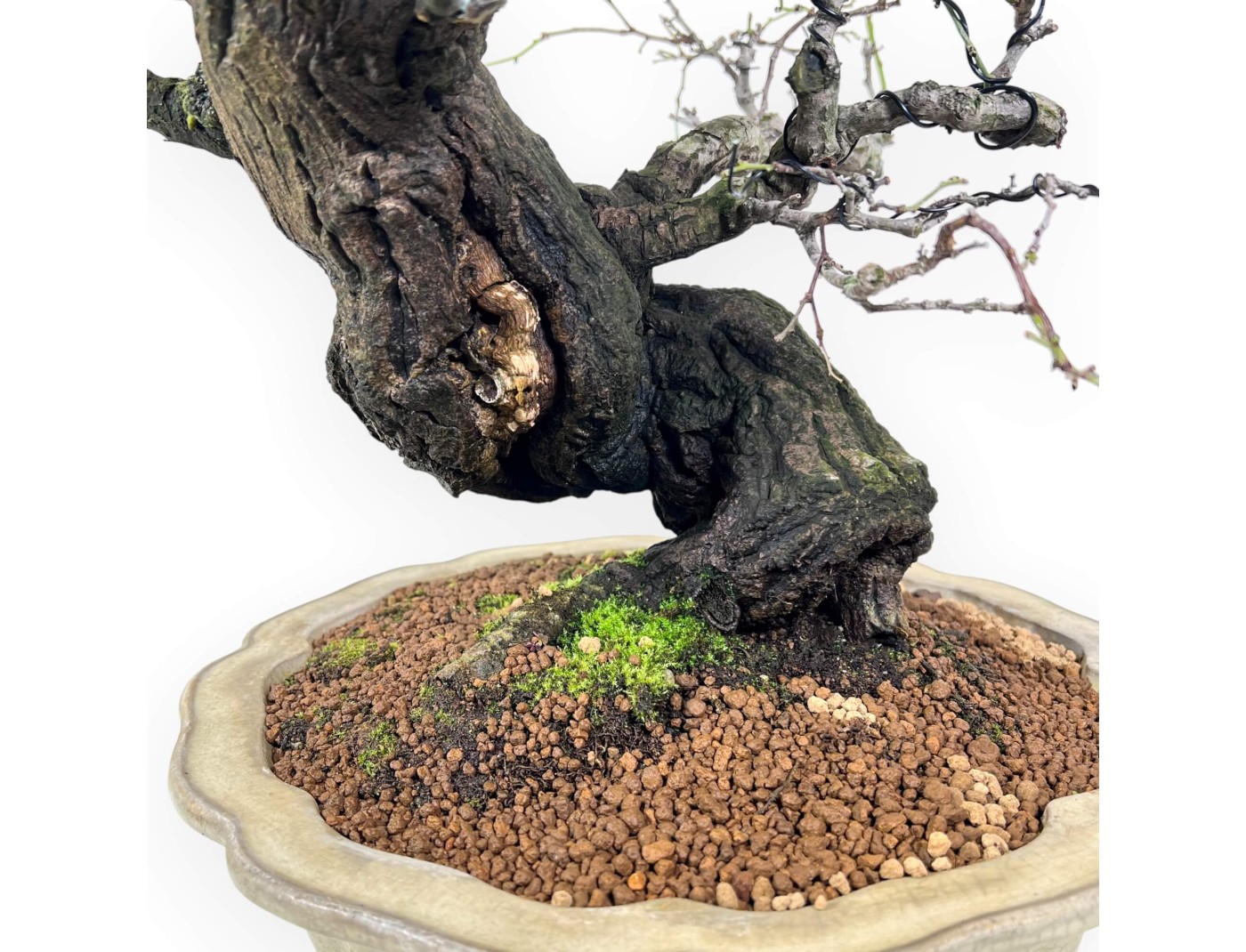 Unique specimen Celastrus bonsai characterized by its height without pot of 47 cm, a trunk size of 7 cm and nebari of 17 cm. The plant is grown in a lotus flower shape pot in glazed stoneware whose dimensions are Ø32xH10 cm.