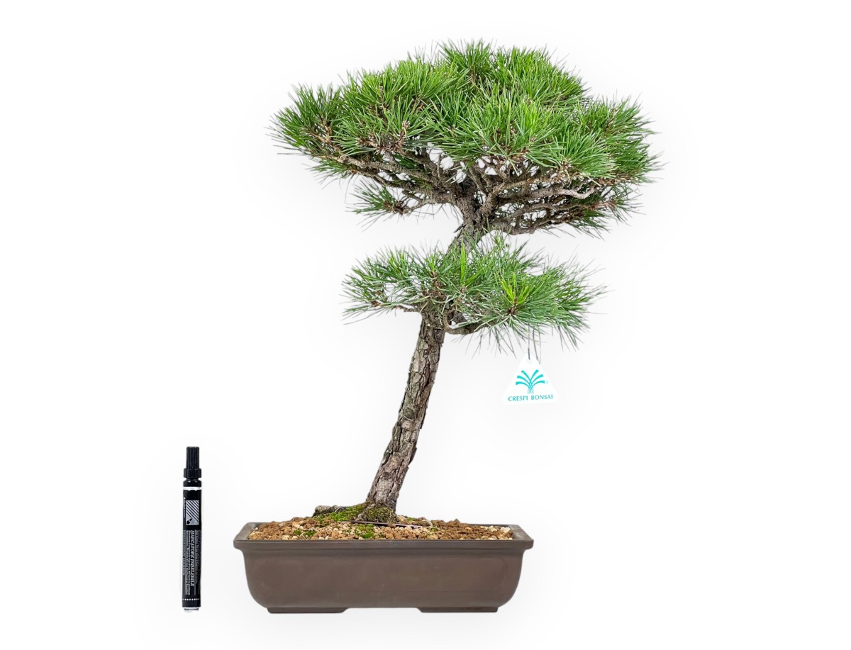 Pine bonsai characterized by a height without pot of 43.5 cm, trunk size of 2,5 cm and nebari of 6,5 cm. The plant is grown in a rectangular unglazed stoneware pot whose dimensions are 24,5x17,5xH6,5 cm.