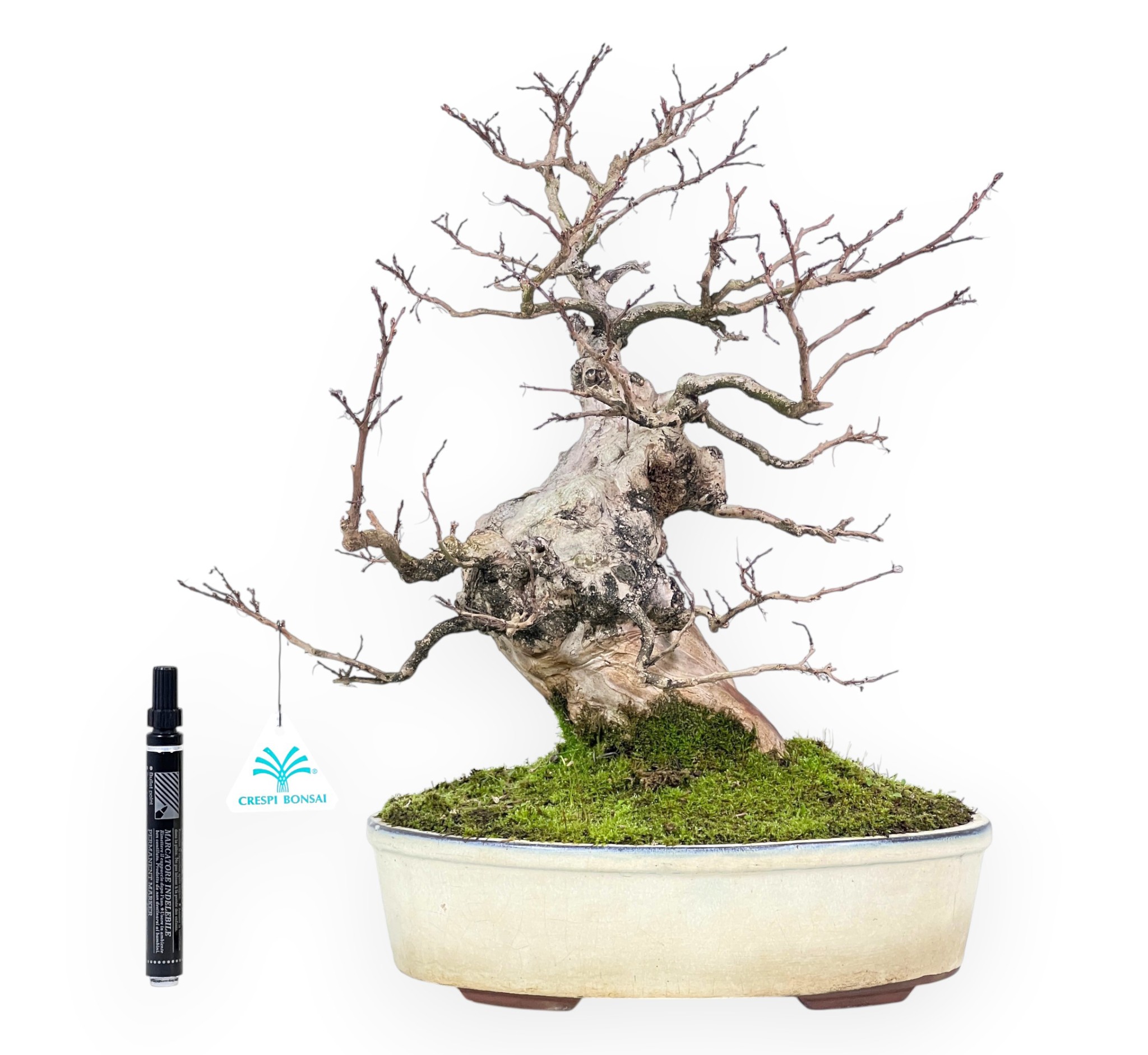 Lagerstroemia bonsai (crape myrtle), an ornamental deciduous tree particularly prized for its spectacular summer flowering, characterised by light, ruffled inflorescences in shades of violet-pink, which lend great vivacity and refinement to the foliage. In spring it develops small, well-proportioned, bright green leaves that turn to warm yellow-orange shades in autumn before dropping. During the winter, complete shedding of the leaves emphasises the elegant silhouette and fine, well-distributed, harmonious branching. The trunk is powerful and lively, with natural curves. The pale, slightly exfoliating bark adds further aesthetic value, recalling the mature appearance of specimens in the wild. The nebari is clearly visible and contributes to a solid visual basis. The bonsai is grown in an oval pot made of glazed stoneware in light, delicate tones that harmonise with the bark and surface moss.