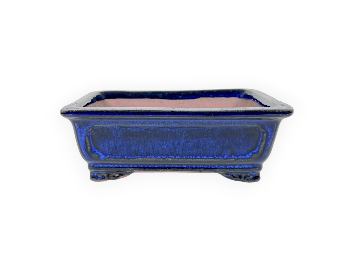 Chinese bonsai pot, handmade, rectangular, made of blue glazed stoneware.