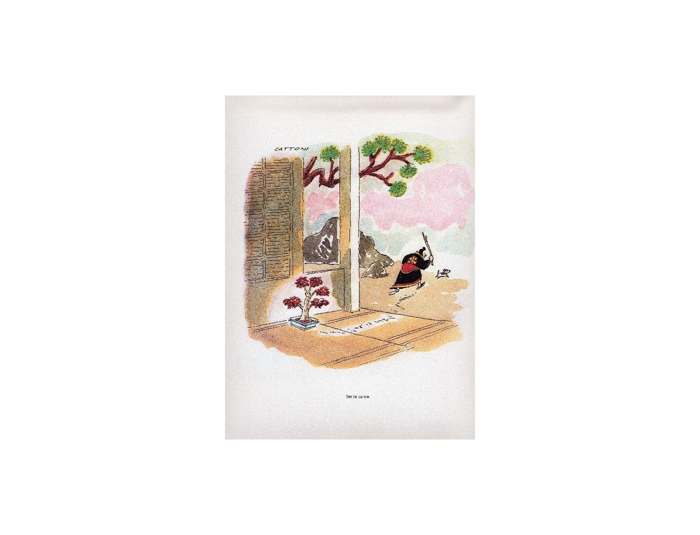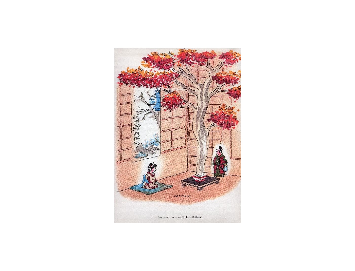 Cast iron bell with a rectangular cardboard with the illustration of clouds and a japanese red writing