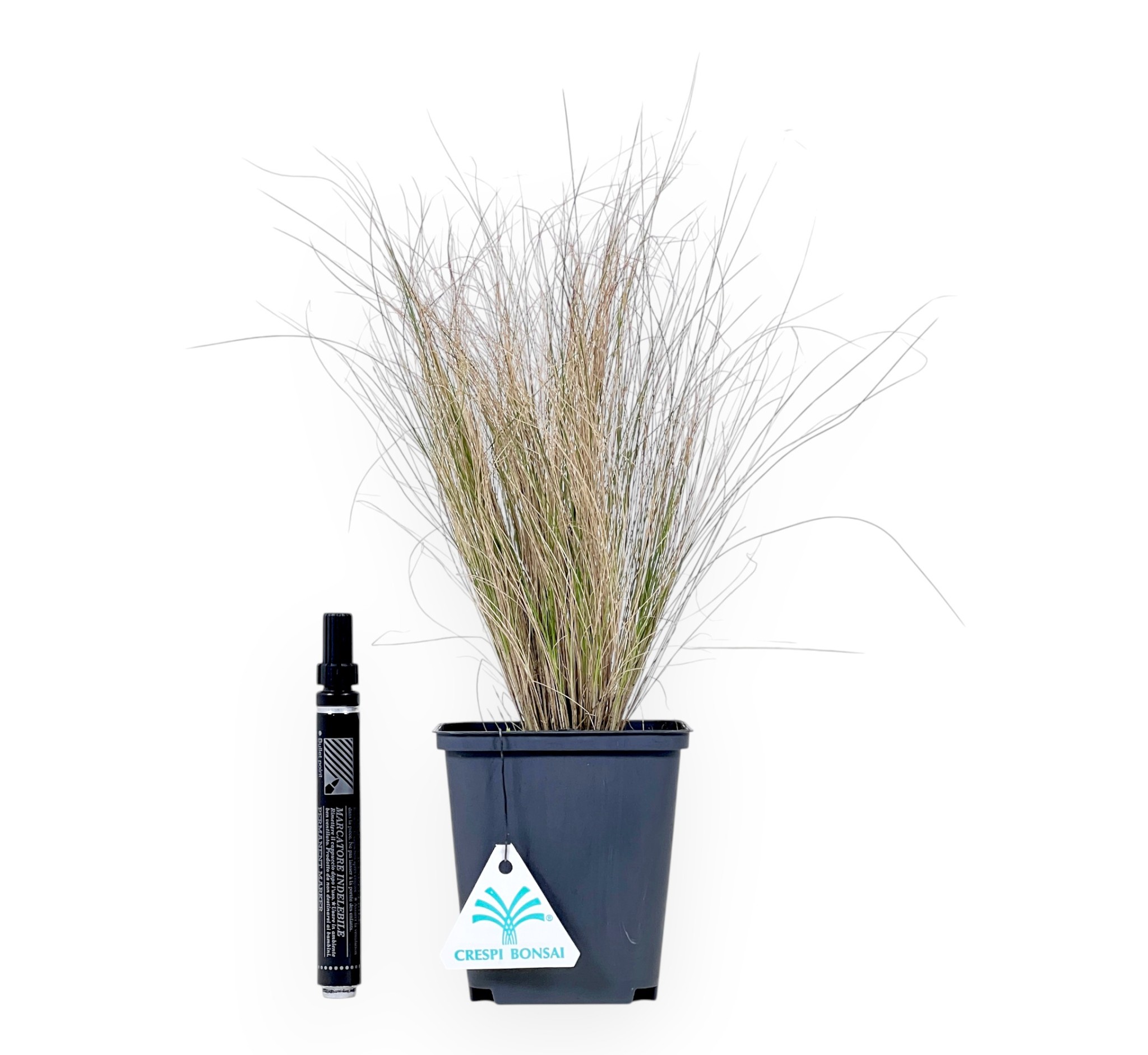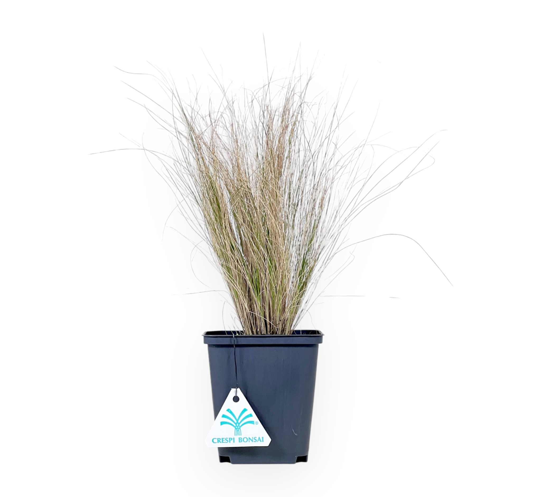 Hakonechloa halo plant characterised by a height without pot of 21.5 cm and a trunk size of 1 cm. The plant is grown in a round plastic pot whose dimensions are Ø14x11.5 cm.