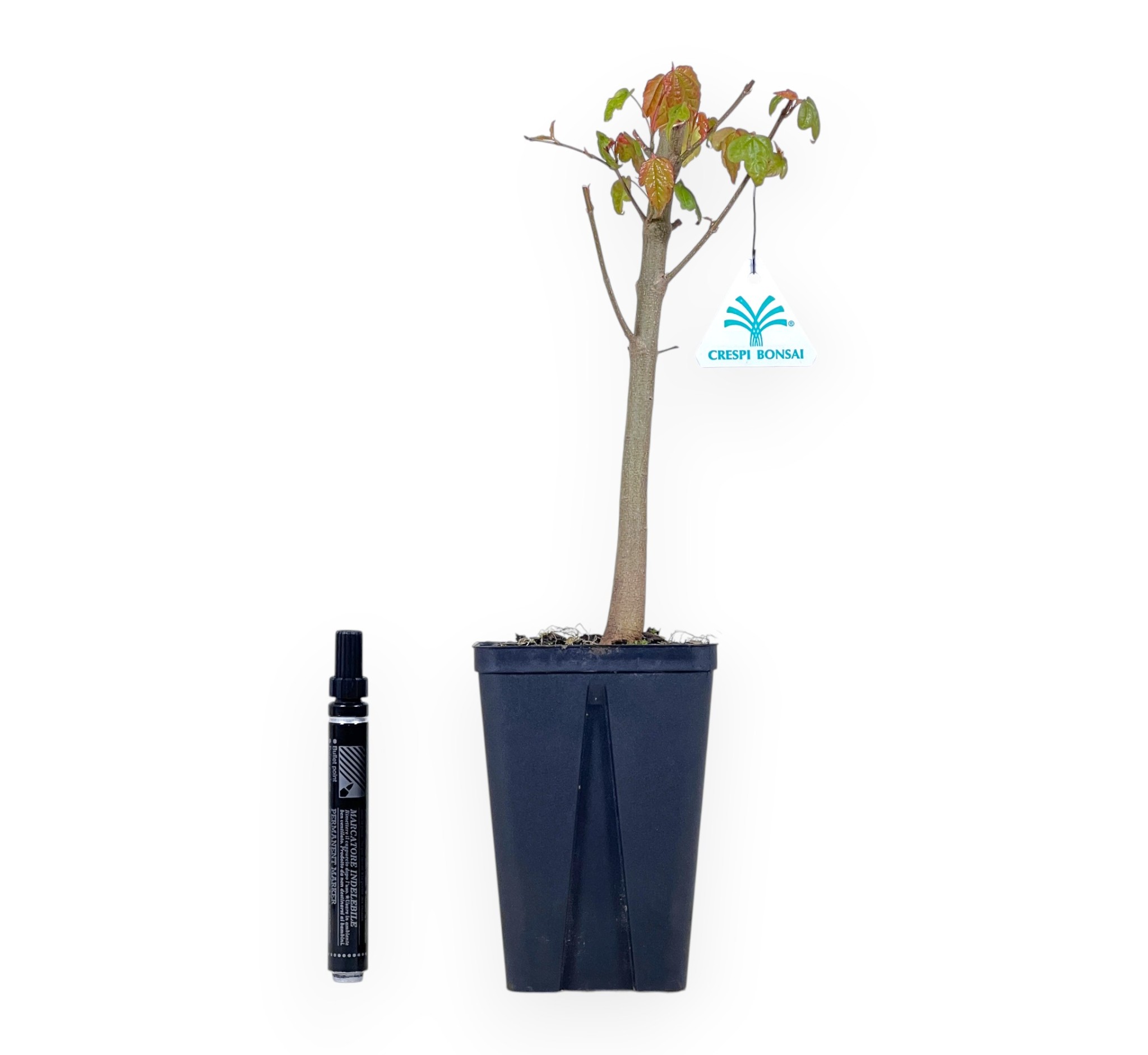 Working plant of Acer buergerianum, a slow-growing deciduous species prized for its grey bark that flakes with time and the beautiful autumn colouring of its leaves, which turn from yellow to red. It has a branched form and a neat habit, making it ideal to be grown as a bonsai. Hardy and easy to shape, it is a perfect choice for bonsai enthusiasts. It is grown in a square black plastic pot.