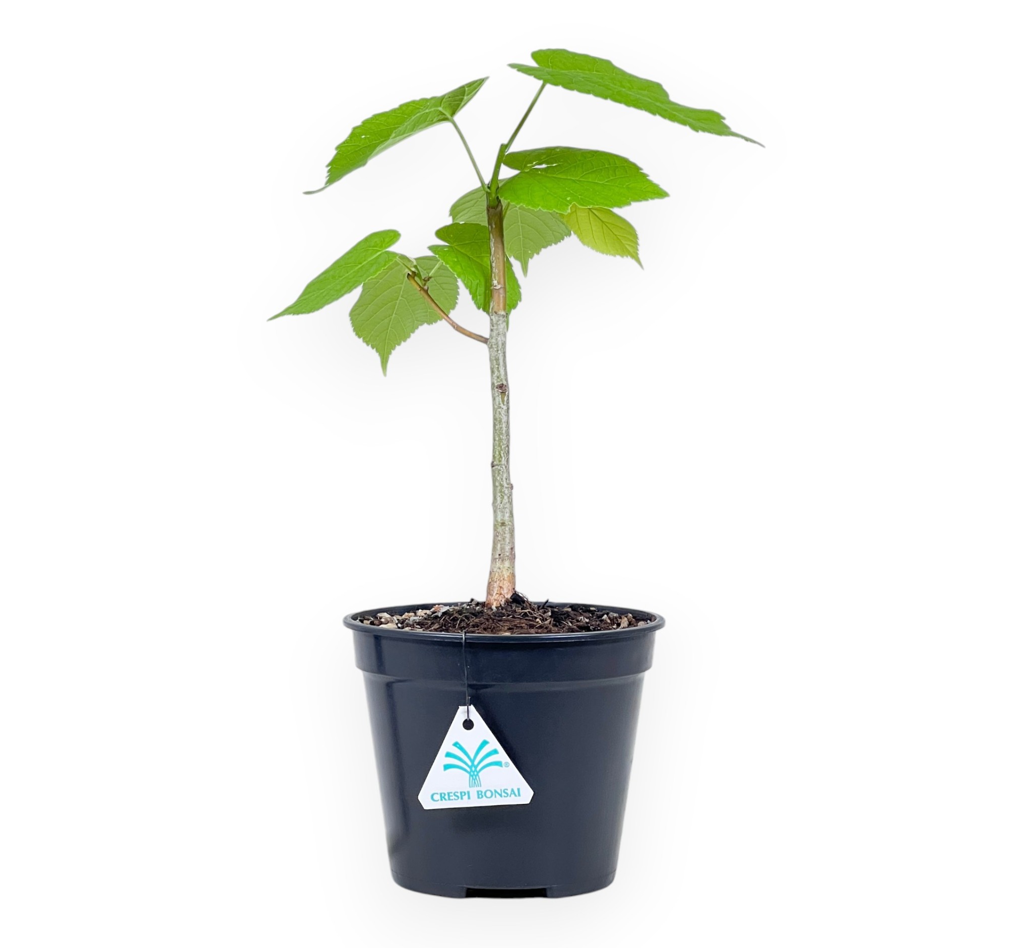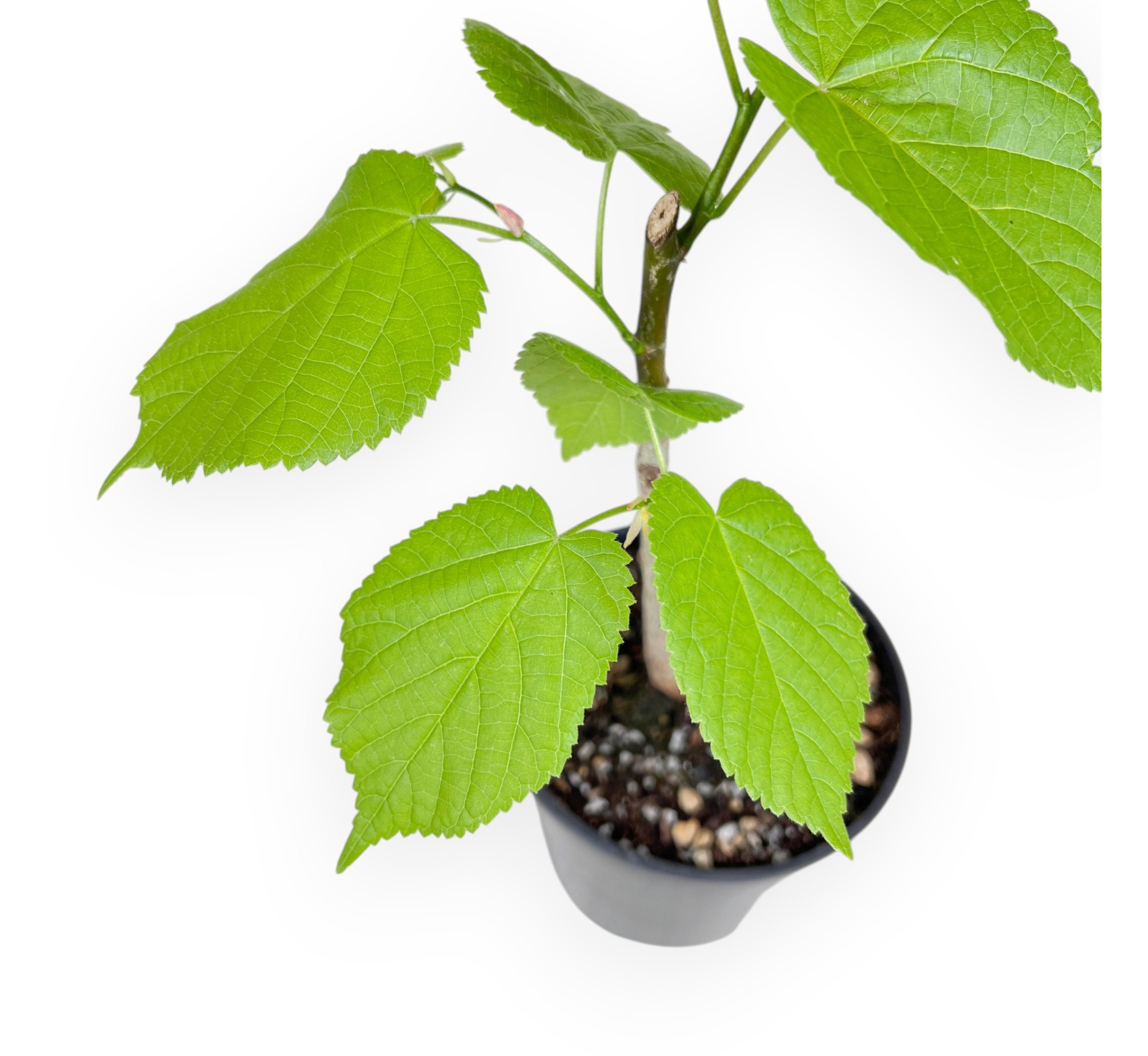 Working plant of Tilia platyphyllos characterized by a height without pot of 23,5 cm, and a trunk size of 1 cm. The plant is grown in a round plastic pot whose dimensions are Ø14xH11,5 cm.