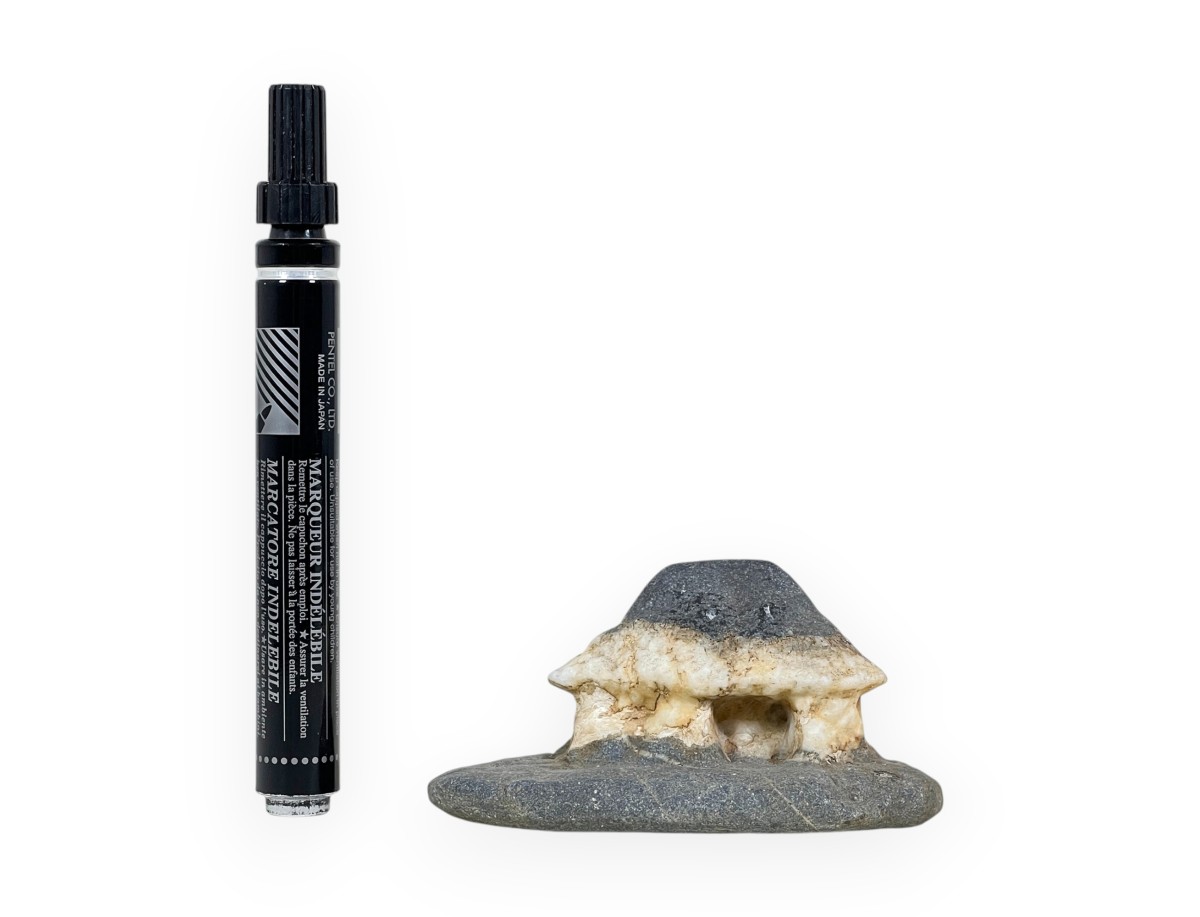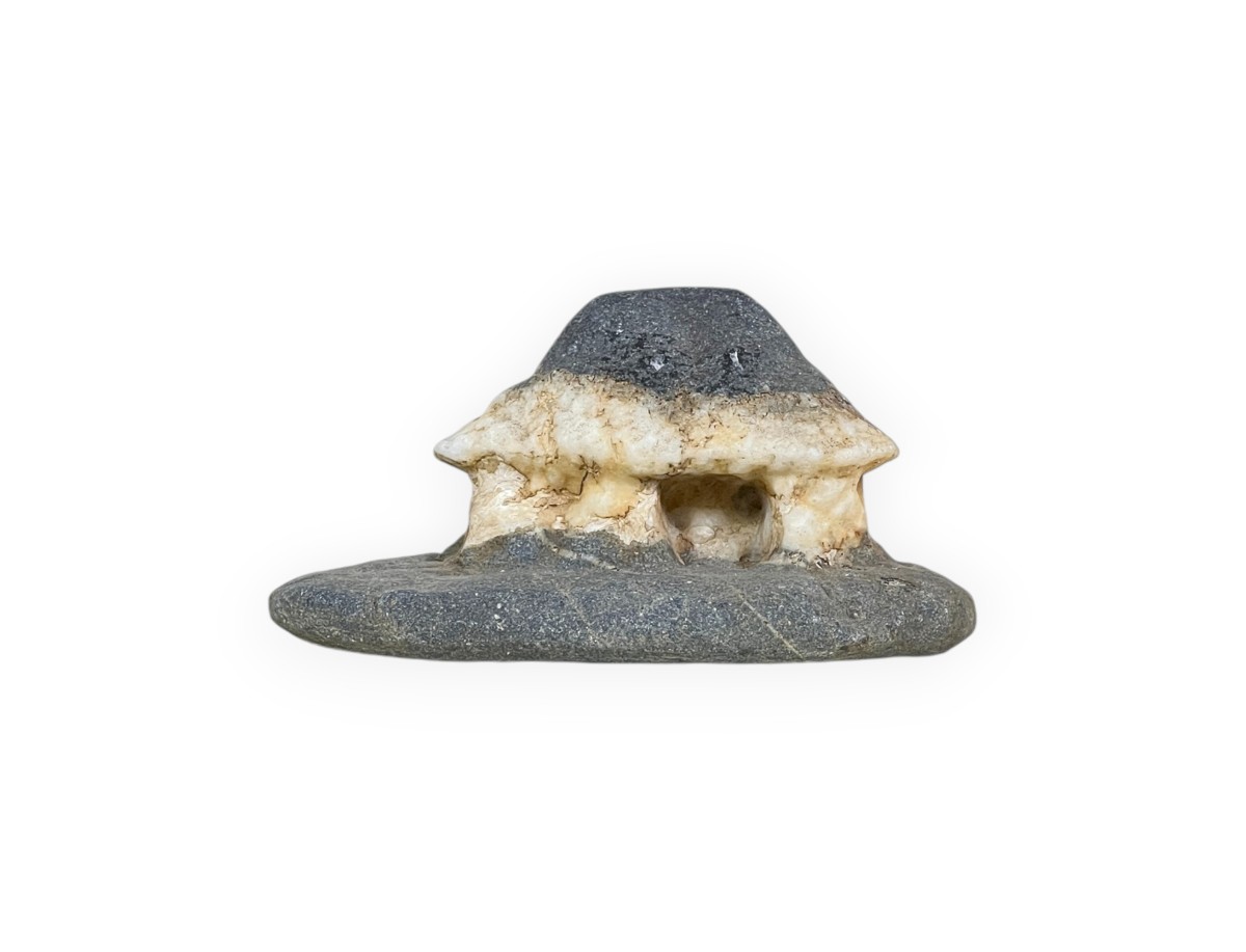 This Japanese suiseki features a natural shape that recalls a small hut: the dark gray, conical top evokes a sloping roof, while the lighter central band in cream and beige tones suggests the walls of the hut. A cavity in the front recalls an entrance or a window, further accentuating the resemblance to a rural dwelling.