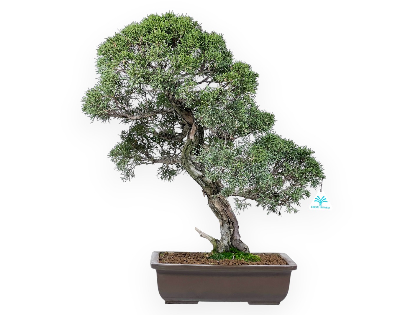 El bonsái de Juniperus Chinensis (enebro) es una conífera de hoja perenne apreciada por su elegancia y resistencia a diferentes condiciones. La copa tiene una ramificación compacta de color verde intenso y el tronco es sólido y bien proporcionado. Cultivado en estilo inclinado (Shakan), presenta un tronco que se inclina con elegancia hacia un lado, lo que le da movimiento y naturalidad. Presenta gin visibles en las ramas y shari en el tronco, lo que confiere a la planta un aspecto antiguo y fuerte. Este estilo mezcla madera viva y madera muerta, resaltando la resistencia y la belleza de la planta. El bonsái se cultiva en una maceta rectangular de gres sin esmaltar que realza la belleza del bonsái y le confiere un aspecto dinámico y refinado.