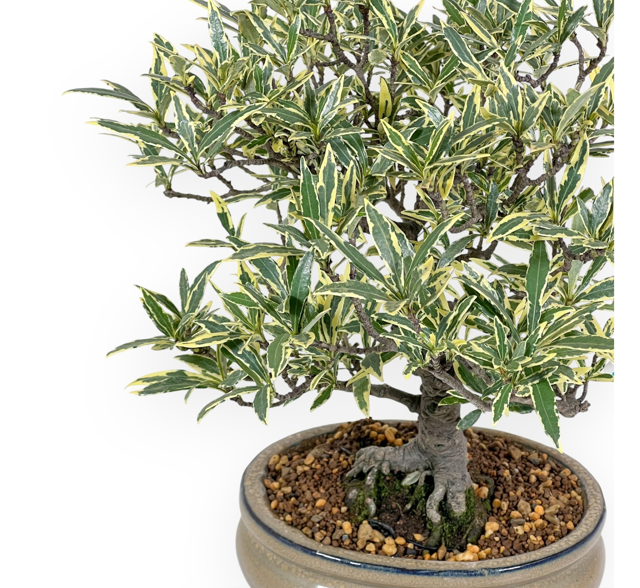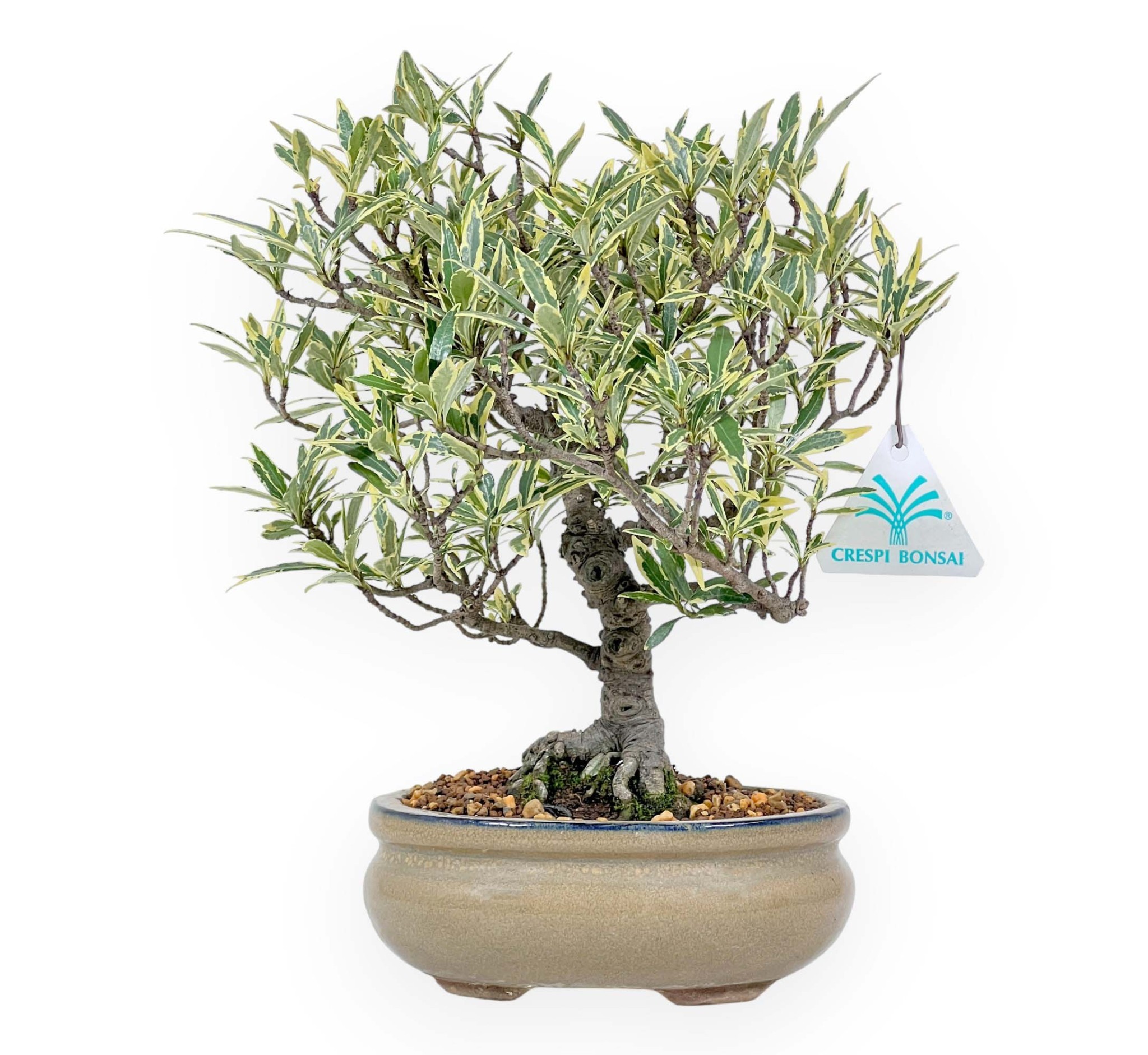 Bonsái en flor, en maceta ovalada de gres esmaltado beige oscuro