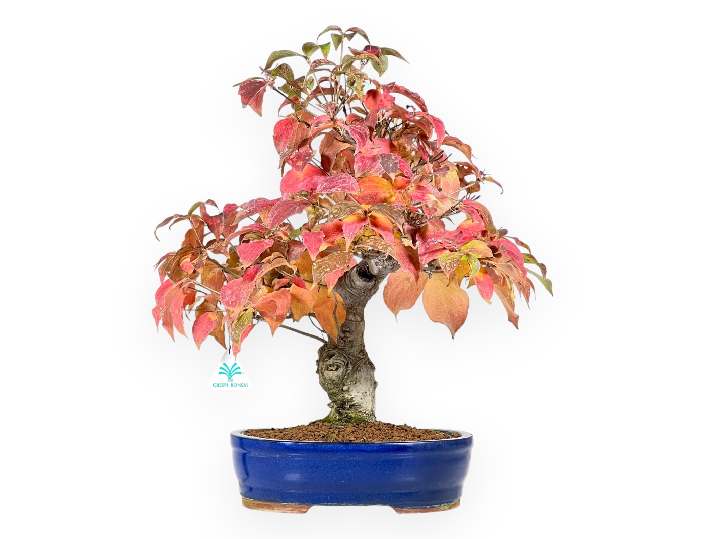Este bonsái de Cornus kousa (cornejo) es un árbol caducifolio de floración y fructificación, apreciado por su belleza estacional y su elegante estructura. Sus hojas pasan del verde claro al verde intenso y brillante en primavera; se vuelven rojas, naranjas y amarillas en otoño, creando un espectacular juego de colores; y pierde sus hojas en invierno. El Cornus es conocido por sus pequeñas flores amarillo-verde a finales de primavera o principios de verano, y por la producción de pequeños frutos (drupas) de color entre rosa y rojo, con pulpa amarillo-anaranjada en su interior. Cultivado en un estilo vertical informal (Moyogi), tiene un tronco sólido y un follaje natural y bien desarrollado. La maceta oval de gres esmaltado azul contrasta elegantemente con los tonos del follaje.