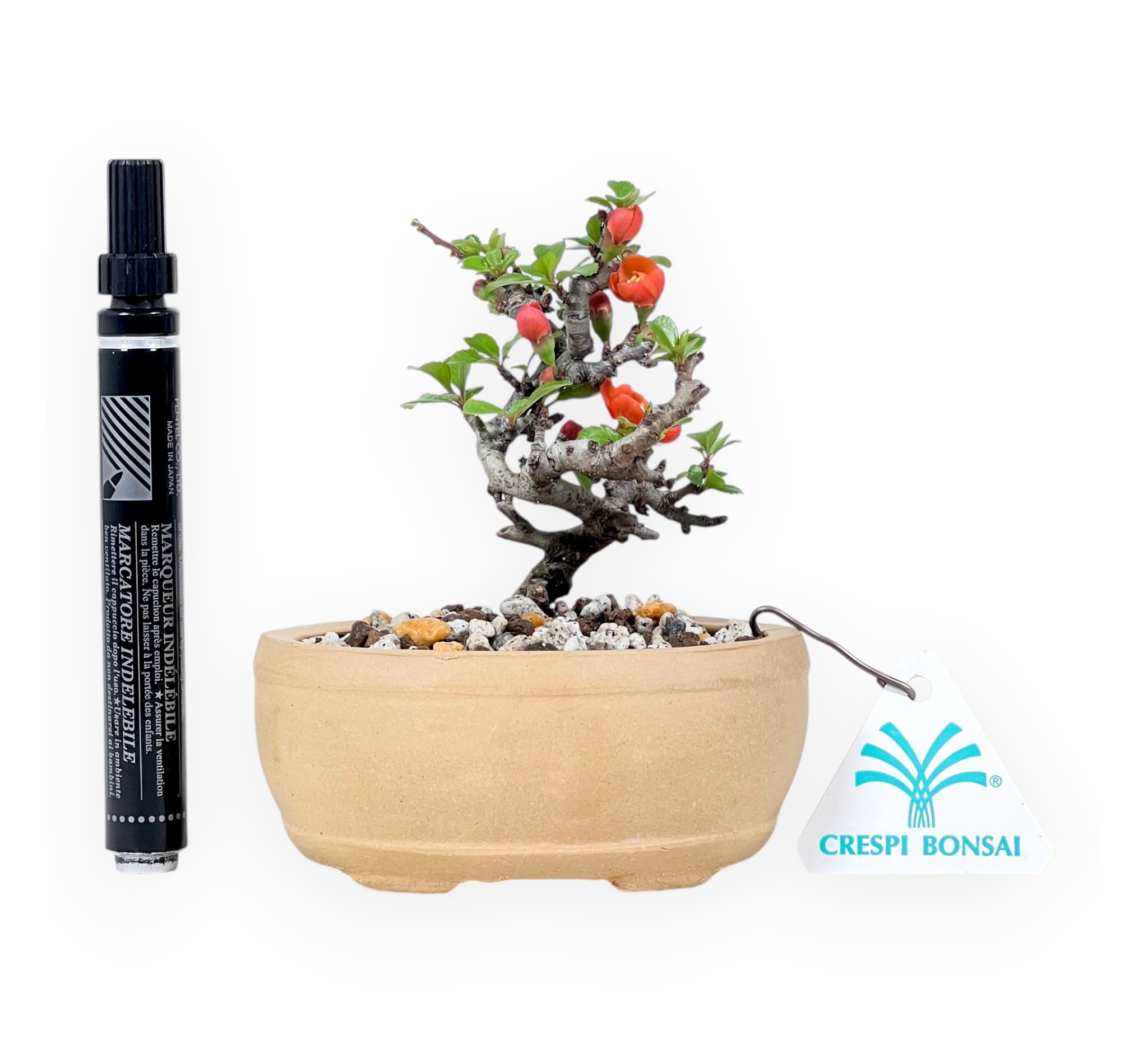 Bonsái shohin de Chaenomeles speciosa: especie caducifolia muy apreciada por su floración precoz y abundante en tonos rojo anaranjado brillante, que anticipa la aparición del follaje. Las delicadas flores, con prominentes estambres dorados, destacan a lo largo de las ramas aún parcialmente desnudas, creando un fuerte impacto ornamental. El follaje, que posteriormente se desarrolla con pequeñas hojas de color verde brillante, mantiene una estructura compacta y armoniosa, deshojándose durante la estación invernal. Tiene un tronco bien proporcionado con movimiento sinuoso y una corteza madura que da carácter a la planta. El bonsái se cultiva en un elegante jarrón ovalado de gres de color claro, con superficies ligeramente texturadas y decoraciones en relieve, que crea un refinado contraste con la intensidad cromática de la floración, realzando el equilibrio estético general.