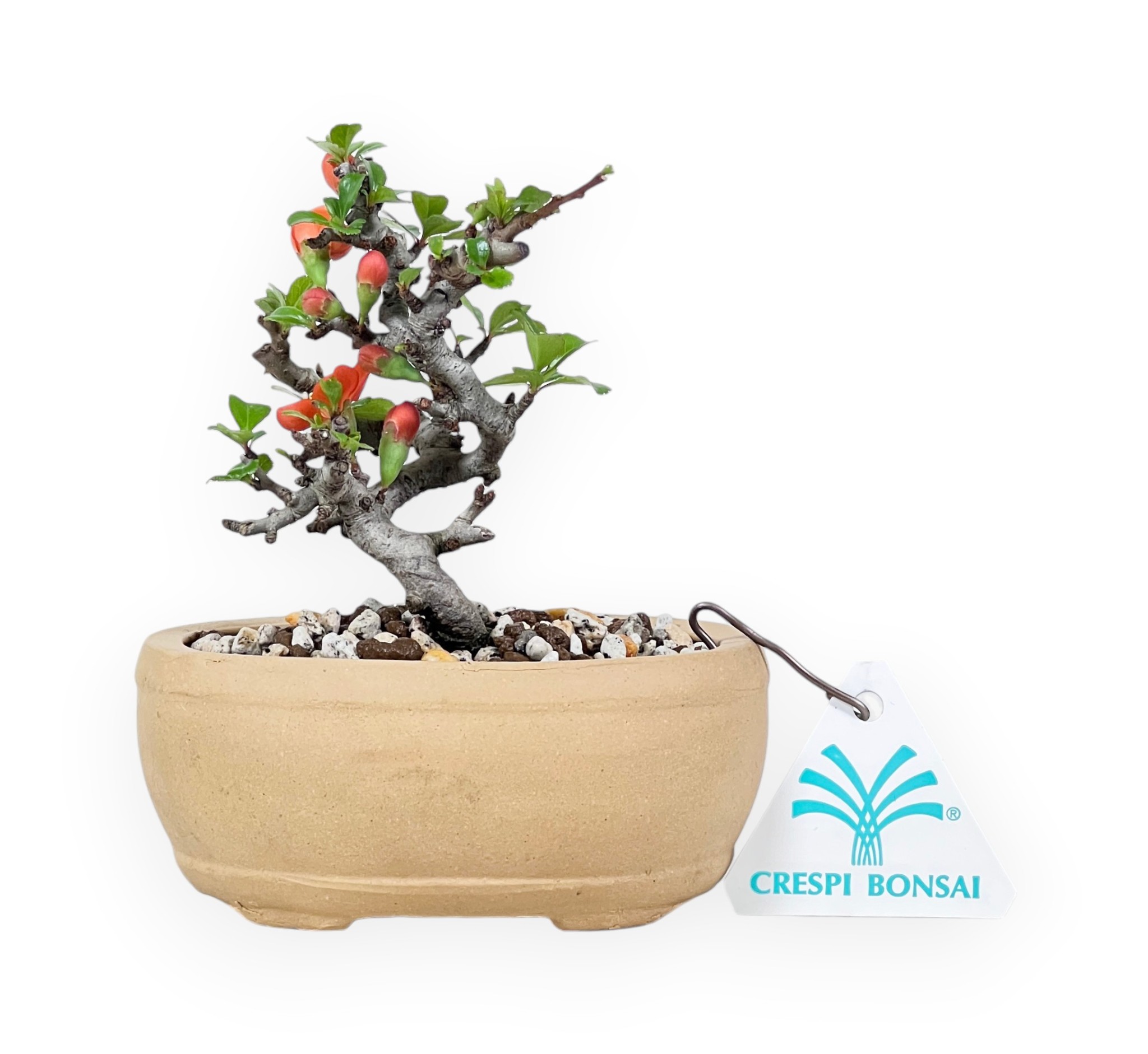 Bonsái de Chaenomeles caracterizado por una altura sin maceta de 8,5 cm y un tamaño del tronco de 0,8 cm. La planta se cultiva en una maceta ovalada de gres transparente cuyas dimensiones son 10,5x7,5x4,5 cm.
