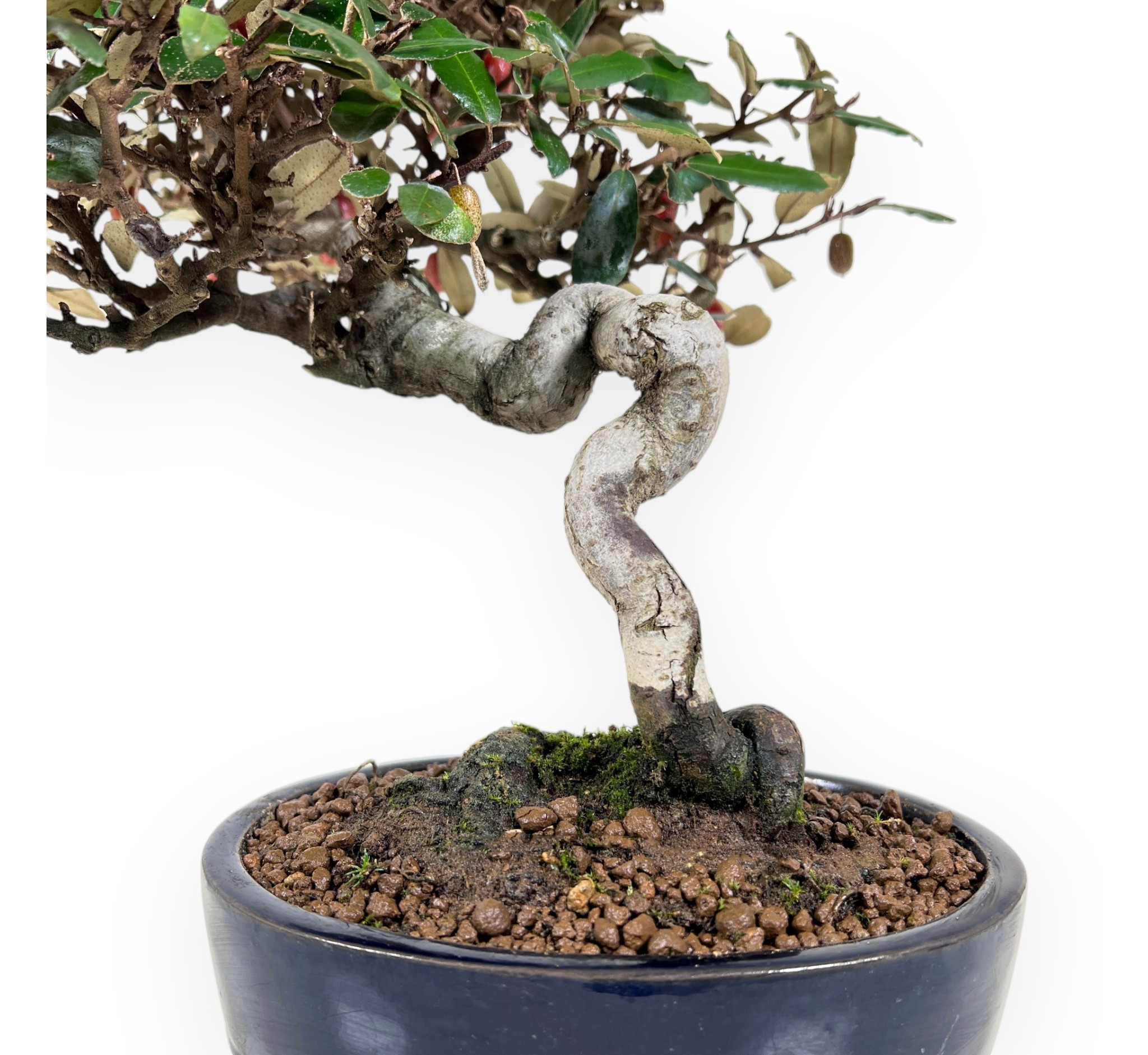 El Eleagnum, frecuentemente cultivado en forma de bonsái, es popular no sólo como especie frutal, sino también por su elevado potencial para el bonsái. Hay varias especies que maduran sus frutos desde finales de primavera hasta el otoño y todas ellas son un espléndido material de formación. Entre ellas, el Elaeagnus pungens es robusto y fácil de entrenar. Si se tienen en cuenta las hojas, los frutos, el tronco, todo hace que sea una especie especialmente adecuada para ser convertida en bonsái. Generalmente, si se pregunta a un aficionado por qué no cultiva Eleagnus pungens, la respuesta más frecuente se refiere a la dificultad de verlos en fruto. Sin embargo, son árboles con características espectaculares, como que la corteza se vuelve casi negra al madurar, y si se cuidan adecuadamente, también dan grandes satisfacciones en fructificación. En el arte del bonsái, los estilos a los que mejor se adaptan son: vertical informal, inclinado, postrado y en cascada.