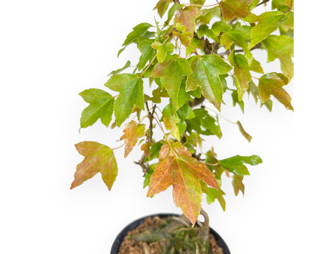 Este bonsái de Acer buergerianum (arce) es una especie caducifolia, apreciada por su característico follaje que cambia de color a medida que avanzan las estaciones. Durante la primavera y el verano, sus hojas son de color verde brillante, mientras que en otoño adquieren tonalidades rojizas y anaranjadas, hasta que el bonsái pierde sus hojas en invierno. Cultivado en una maceta redonda de gres esmaltado azul oscuro, resalta el verde brillante de las hojas y combina perfectamente con el aspecto refinado del bonsái.
