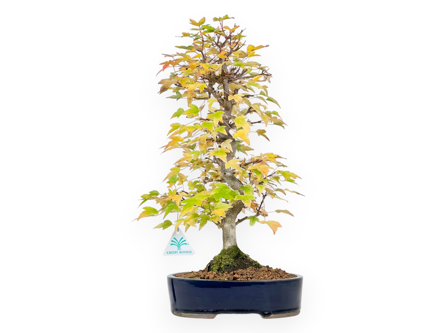 Este bonsái de Acer buergerianum (arce) es una especie caducifolia, apreciada por su característico follaje que cambia de color a medida que avanzan las estaciones. Durante la primavera y el verano, sus hojas son de color verde brillante, mientras que en otoño adquieren tonalidades rojizas y anaranjadas, hasta que el bonsái pierde sus hojas en invierno. Cultivado en estilo vertical informal (Moyogi) con tronco sinuoso, aporta movimiento y naturalidad al bonsái. La maceta oval de gres esmaltado azul, contrasta elegantemente con los tonos del follaje, realzando su belleza.