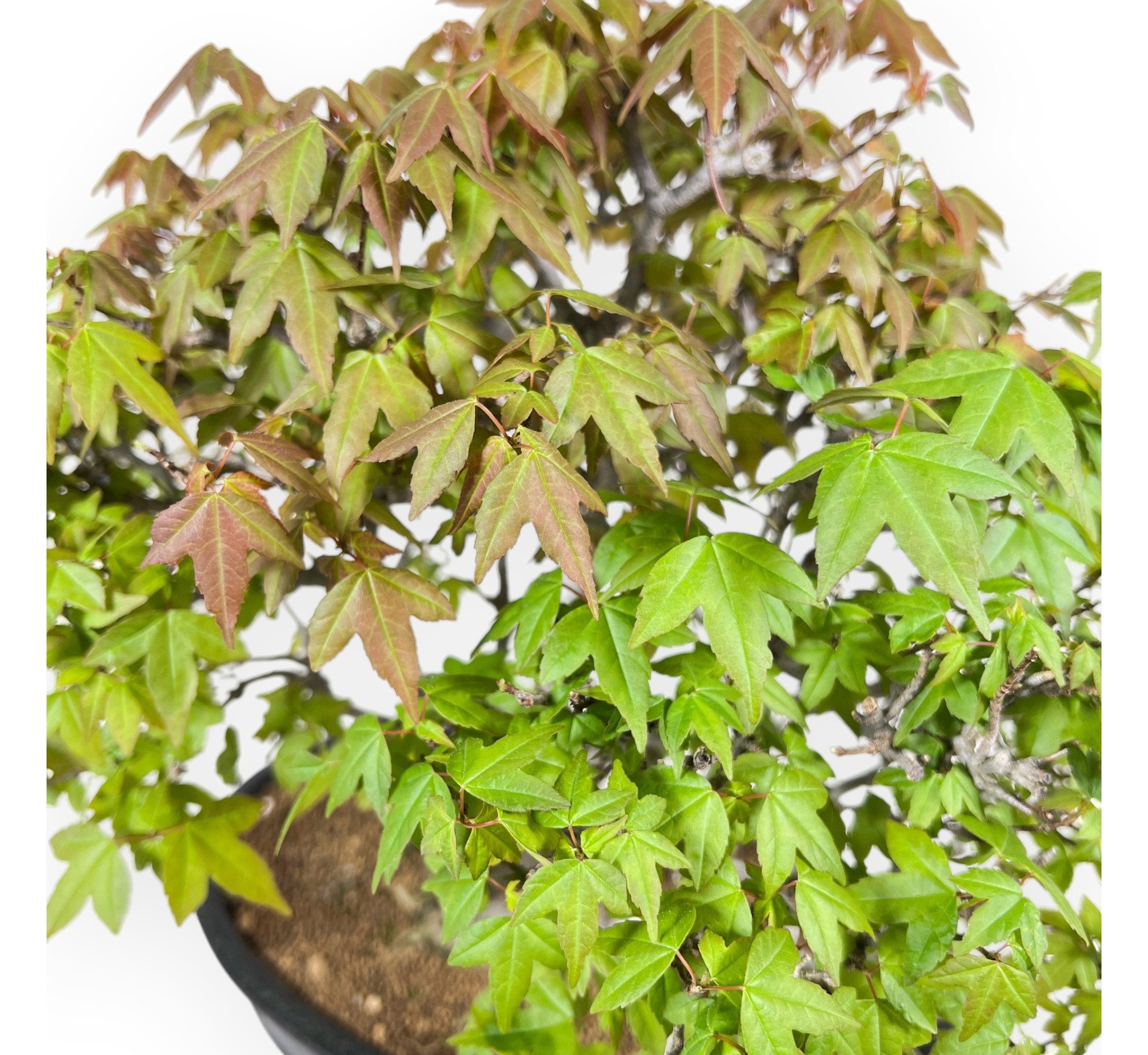 El bonsái shohin de Acer buergerianum (arce), una especie caducifolia, es apreciado por su característico follaje que ofrece una espectacular variación de colores a medida que avanzan las estaciones. Durante la primavera y el verano, sus hojas son de color verde brillante, mientras que en otoño adquieren tonalidades rojizas y anaranjadas, hasta que el bonsái pierde sus hojas en invierno. Tiene un estilo de tocón (Kabudachi) en el que todos los troncos crecen desde la misma base con un único sistema radicular, lo que lo convierte a todos los efectos en un solo árbol. Cultivado en una maceta ovalada de gres esmaltado azul, crea un elegante contraste con el follaje.