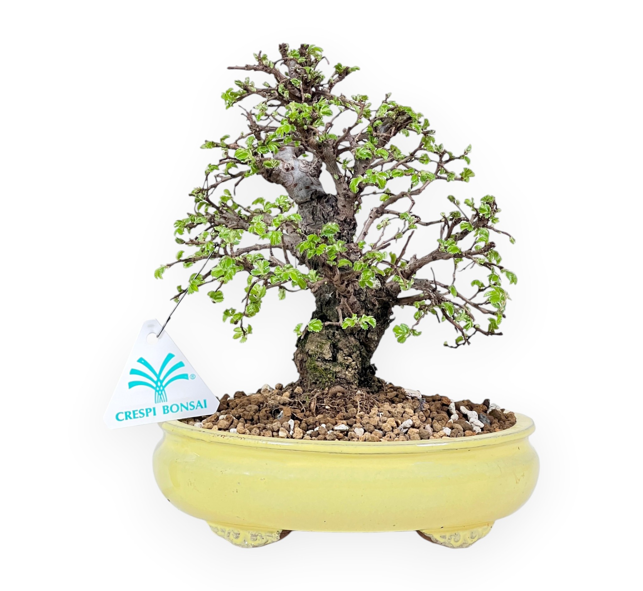 El bonsái de Ulmus Parviflora (olmo) es una especie caducifolia muy apreciada en bonsái por su rusticidad, su crecimiento armonioso y su densa ramificación. Su follaje compacto y equilibrado, compuesto por pequeñas hojas dentadas, confiere al bonsái un carácter maduro y rico. El follaje se vuelve amarillo anaranjado en otoño y pierde sus hojas en invierno. Este ejemplar tiene un tronco muy robusto, de aspecto envejecido, con un desarrollo sinuoso y elegante. El bonsái está cultivado en una maceta ovalada de gres esmaltado amarillo, perfecta para realzar los colores vivos de las hojas y el color oscuro del tronco.