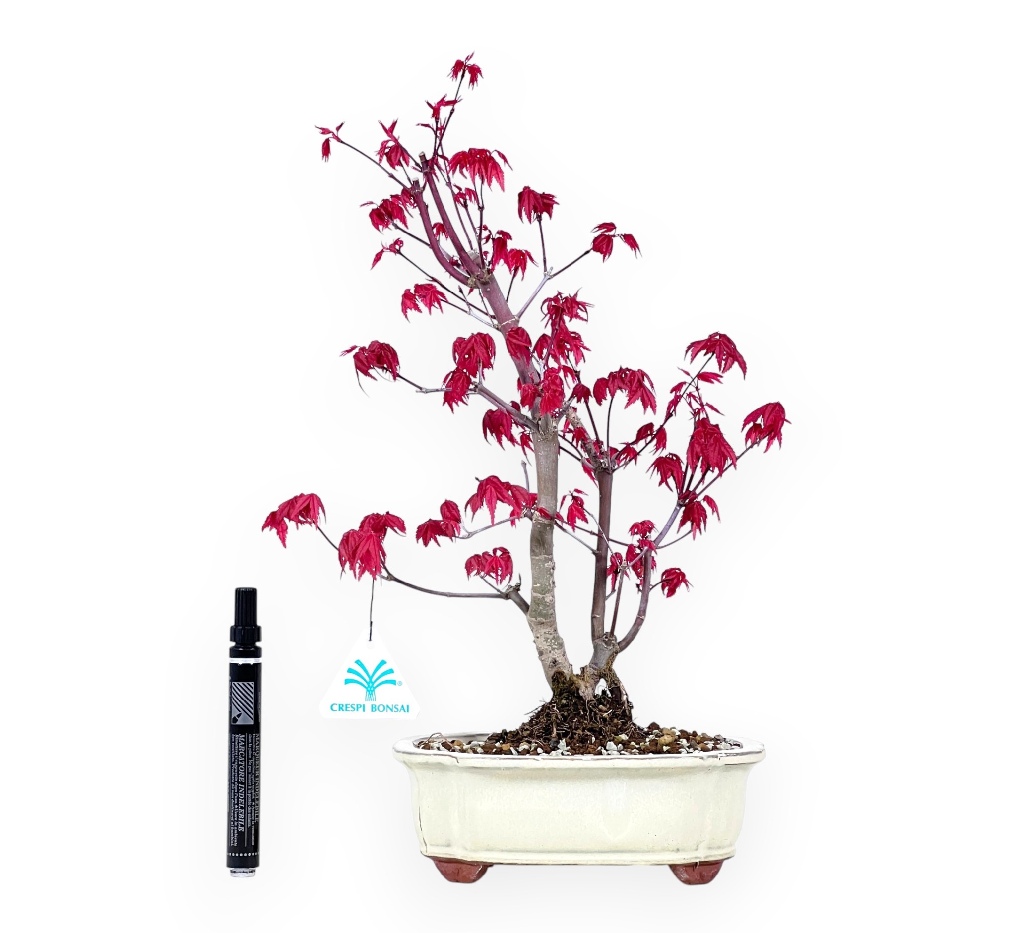 Bonsái de Acer palmatum deshojo (arce) es una especie caducifolia, conocida por sus hojas palmeadas de vibrantes tonos estacionales. Su copa, de color rojo brillante, adquiere tonos que van del rojo intenso al rojo anaranjado en otoño y pierde sus hojas en invierno. De estilo troncos múltiples, se caracteriza por dos troncos que parten de la base, creando una composición equilibrada y dinámica que aporta estabilidad y armonía al bonsái. Cultivado en un maceta nube de gres esmaltado crema, que complementa el bonsái realzando la belleza de la planta, aportándole equilibrio y refinamiento.