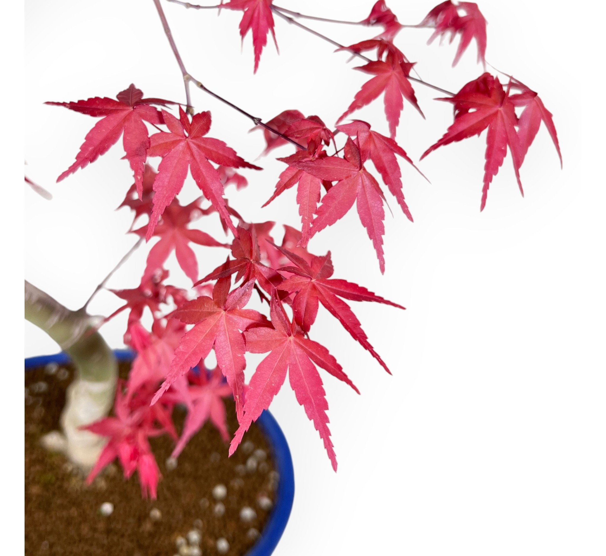 Bonsái de Acer palmatum deshojo (arce), especie de hoja caduca, conocida por sus hojas palmeadas de vivos tonos estacionales. Su copa, de color rojo brillante, adquiere tonos que van del rojo intenso al rojo anaranjado en otoño y pierde sus hojas en invierno. Presenta un tronco de líneas armoniosas, acompañado de una ramificación ligera. La maceta oval de gres esmaltado azul claro, crea un contraste refinado con el color de la vegetación, realzando la composición con elegancia.