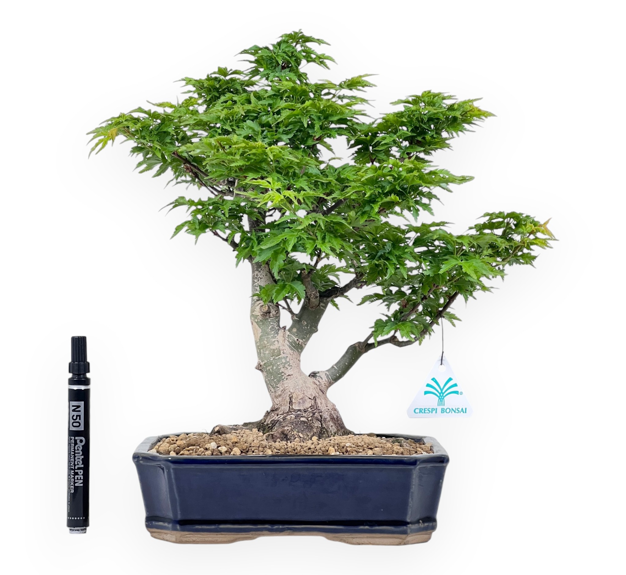 Bonsái de Acer palmatum shishigashira (arce), especie caducifolia, conocida por sus hojas pequeñas y rizadas. El follaje verde brillante se vuelve amarillo dorado, naranja a rojo intenso en otoño y pierde sus hojas en invierno. Cultivado en una maceta rectangular de gres esmaltado azul con esquinas biseladas, contrasta elegantemente con los tonos del follaje, realzando su belleza.