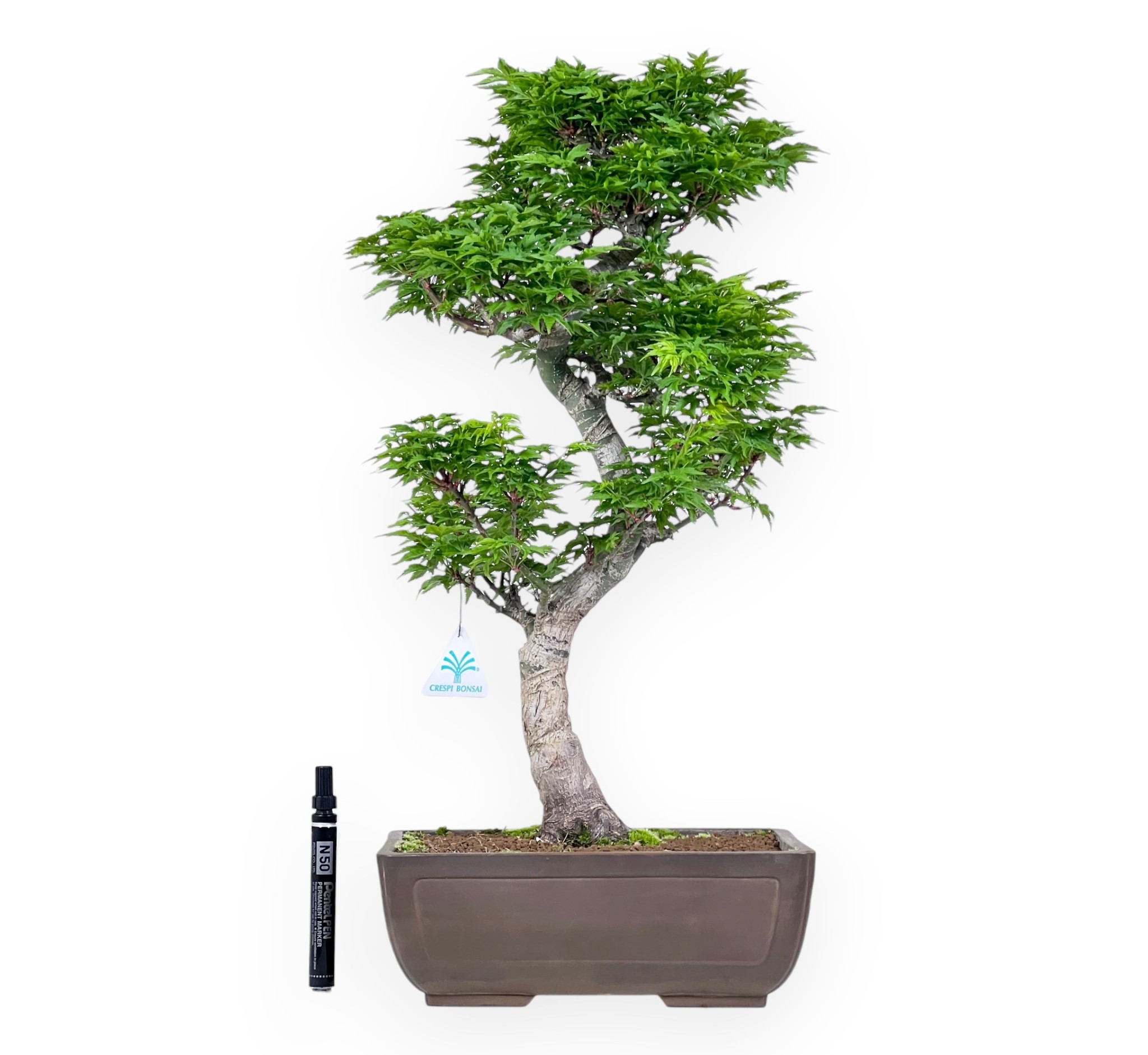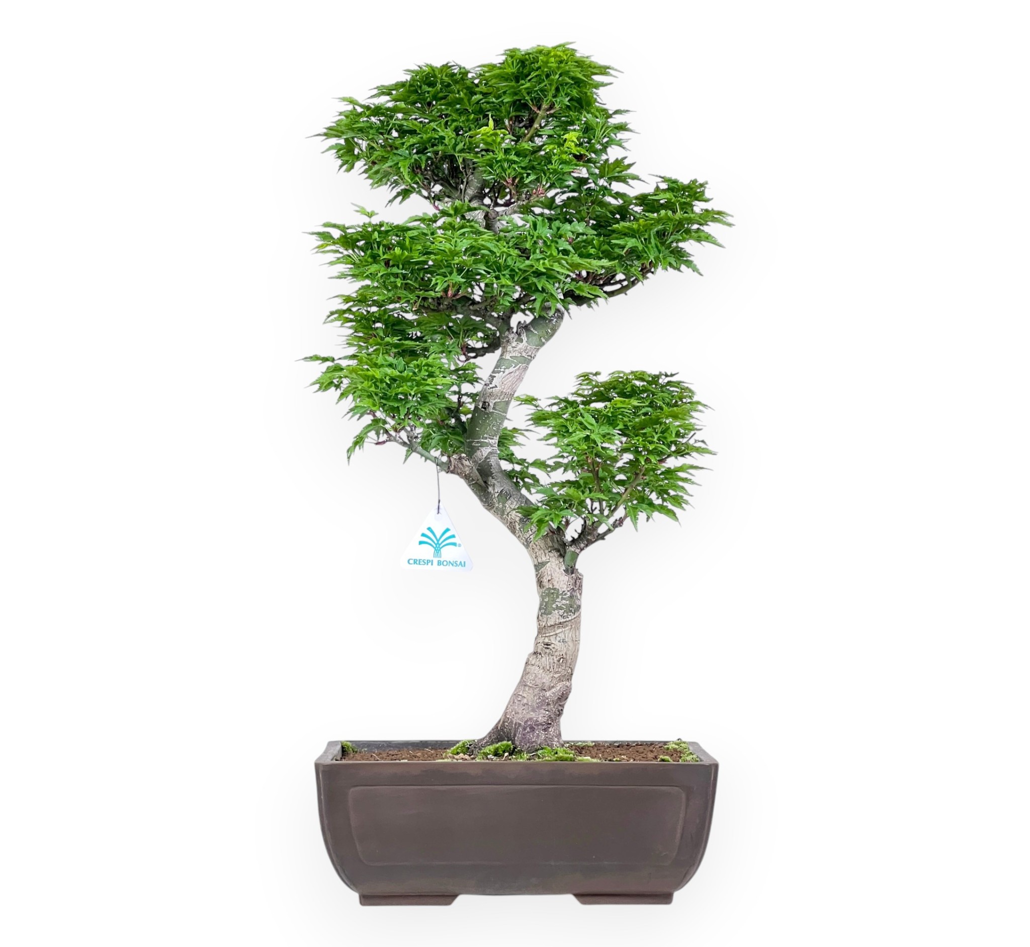 Bonsái de Acer palmatum shishigashira (arce), especie caducifolia, conocida por sus hojas pequeñas y rizadas. El follaje verde brillante se vuelve amarillo dorado, naranja a rojo intenso en otoño y pierde sus hojas en invierno. Presenta un tronco sinuoso que se desarrolla con naturalidad. La disposición de las ramas en varios niveles crea una copa equilibrada y armoniosa, capaz de transmitir movimiento y estabilidad al mismo tiempo, en plena coherencia con los principios estéticos de la tradición del bonsái. Cultivado en una maceta rectangular de gres sin esmaltar, realza la belleza del bonsái y le confiere un aspecto dinámico y refinado.