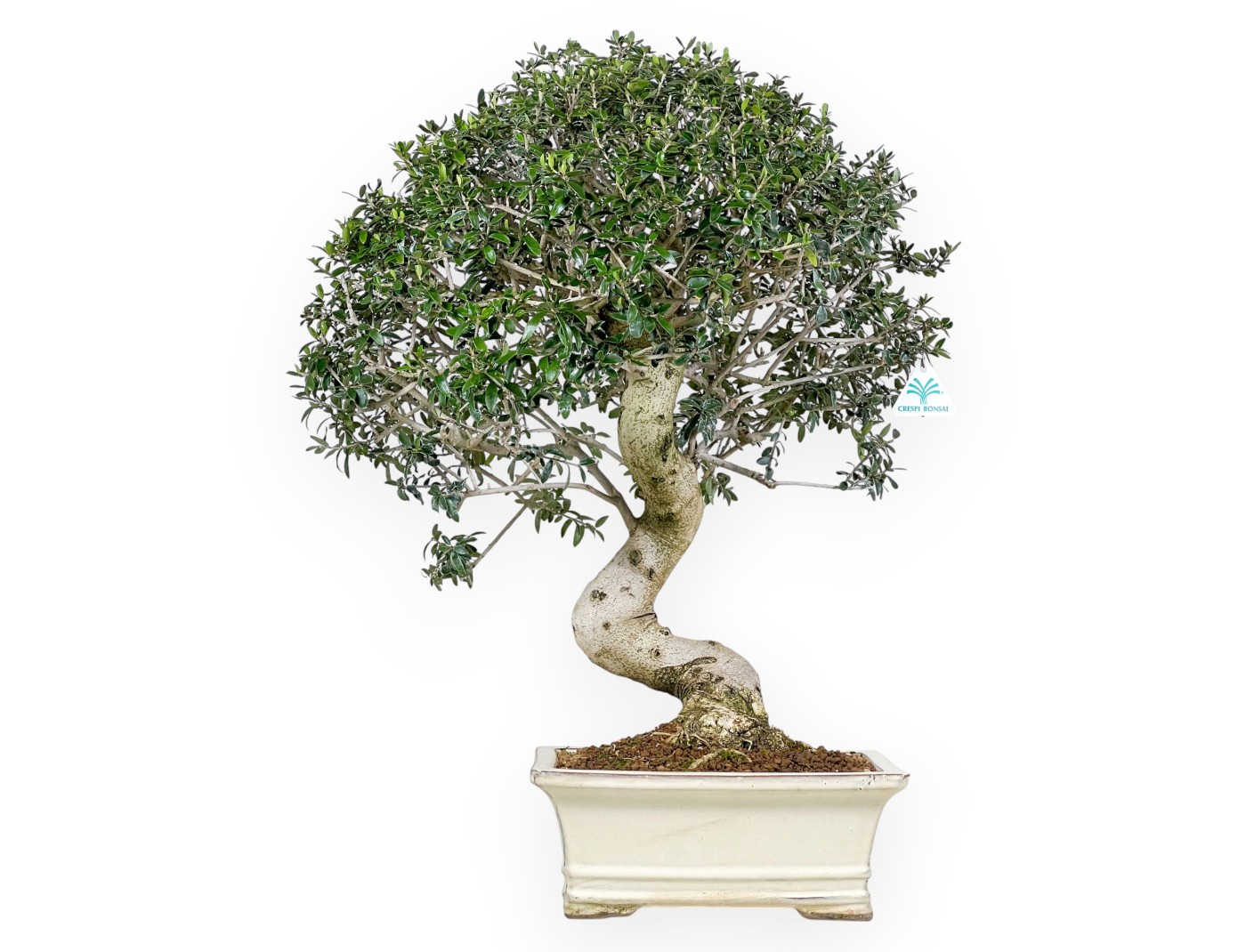 El bonsái de Olea europaea sylvestris (Olivo) perteneciente a la variedad de hoja perenne es apreciado por la belleza de sus hojas plateadas, su floración blanca en primavera y la posterior producción de drupas verdes o púrpuras, las aceitunas, típicas de esta especie. Presenta una estructura fascinante y bien definida, caracterizada por un tronco robusto y raíces bien desarrolladas. La copa, densa y compacta, con ramas que se ramifican de forma ordenada y estructurada, confiere al bonsái un aspecto estéticamente equilibrado. Cultivada en una maceta rectangular de gres esmaltado beige, que le confiere elegancia y resalta el intenso follaje verde.
