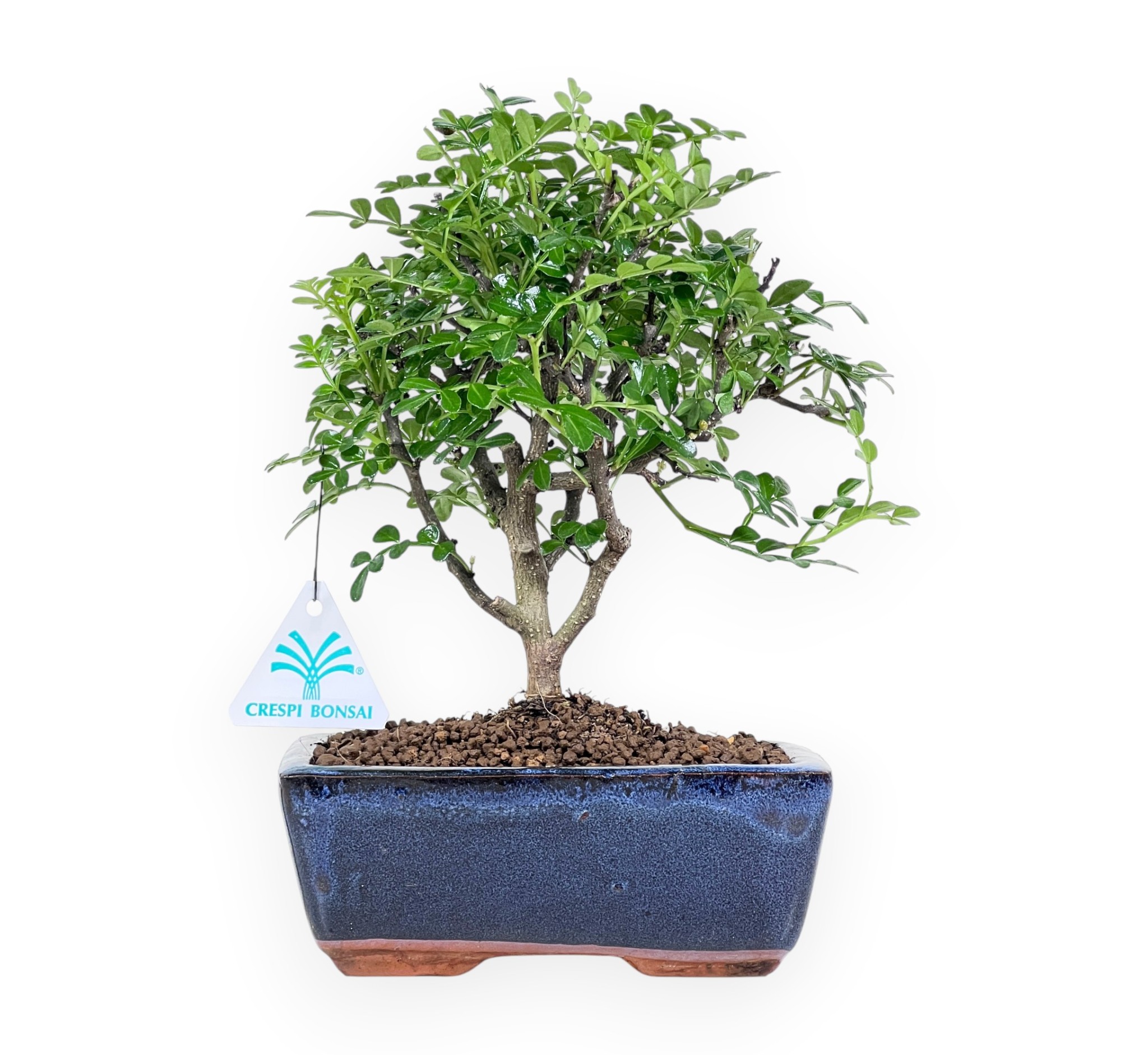 El bonsái de Zanthoxylum piperitum (árbol del pimienta), siempreverde de interior, es apreciado por su denso follaje de color verde brillante, caracterizado por pequeñas hojas aromáticas que aportan movimiento y frescura a la planta. Trabajado en estilo escoba (Hokidachi) con copa amplia y bien distribuida, le confiere un aspecto armonioso. Cultivado en una maceta rectangular de gres esmaltado azul, realza el contraste cromático y realza la estética de la planta.