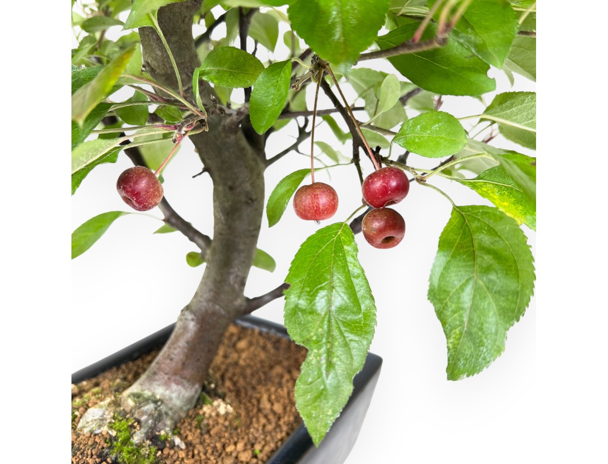 Bonsái de manzano caracterizado por una altura sin maceta de 37 cm, un tronco de 2,5 cm y un nebari de 7 cm. La planta se cultiva en una maceta rectangular de gres esmaltado cuyas dimensiones son 24x15,5xH8 cm.
