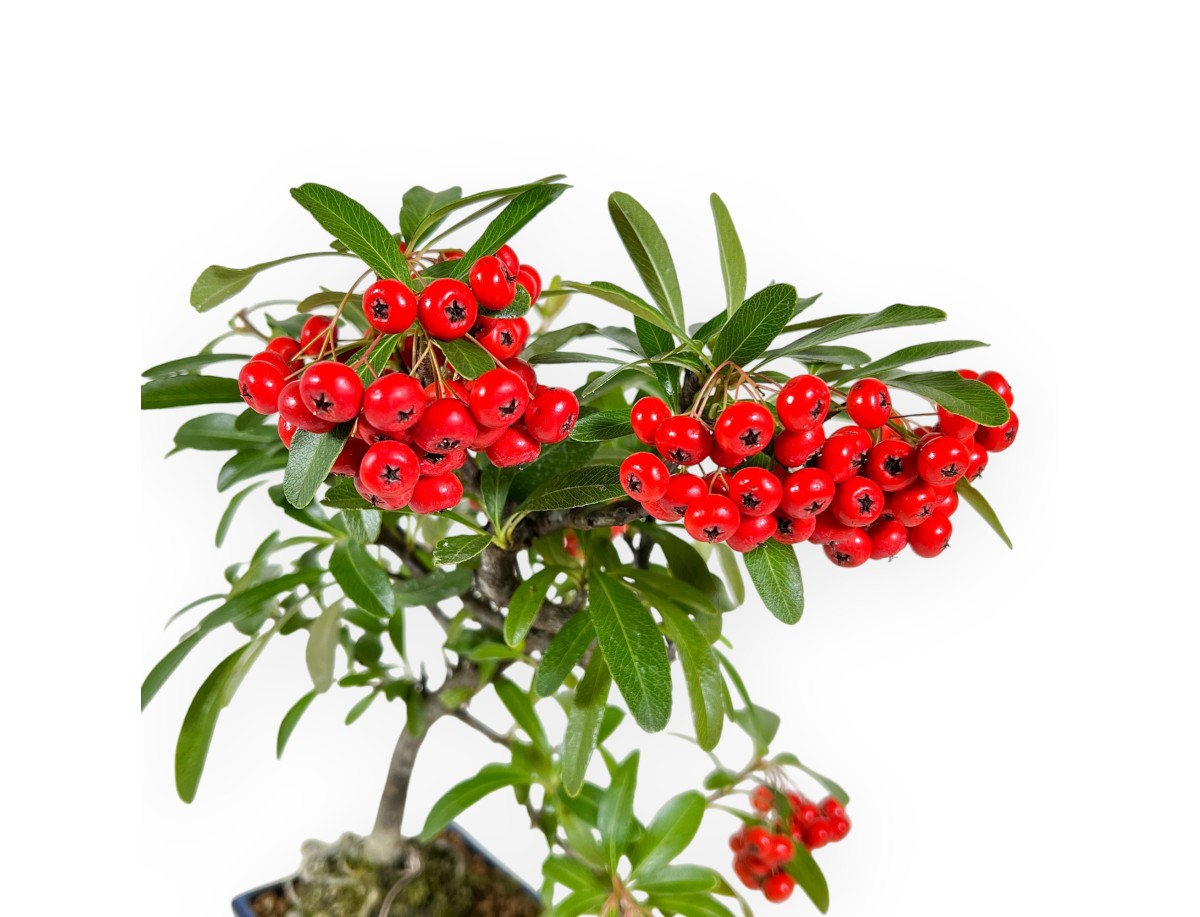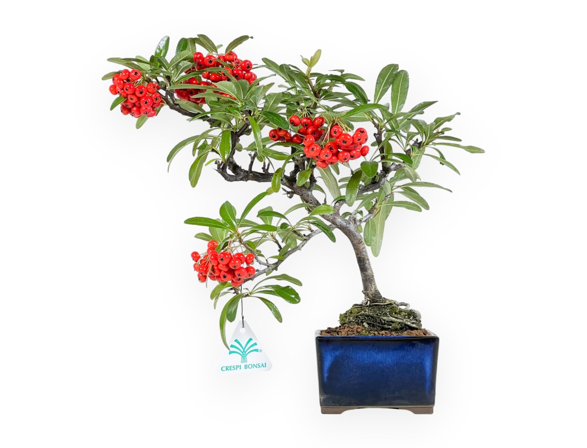 Este bonsái de Pyracantha sp. RED perteneciente a la variedad frutal perenne es apreciado por su floración blanca primaveral y la producción de bayas de color rojas brillante en otoño-invierno. Cultivado en un estilo de raíces expuestas (Neagari) aporta movimiento y naturalidad, añadiendo carácter a la composición. El tronco esbelto y sinuoso sostiene un follaje verde intenso y bien ramificado. Se cultiva en una maceta cuadrada de gres esmaltado azul, que aporta elegancia y resalta el follaje verde intenso y las bayas rojas.