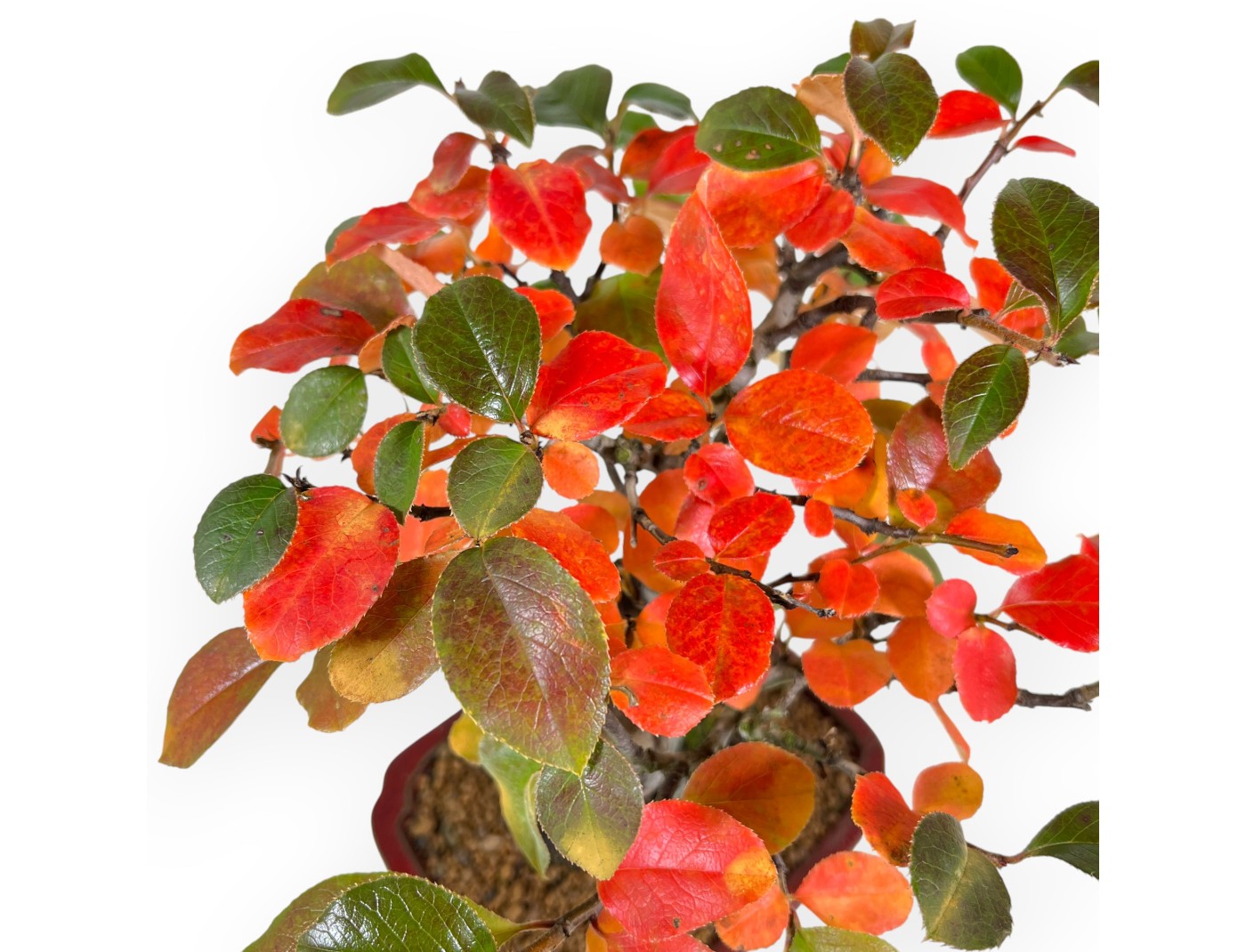 Este bonsái de Pseudocydonia chinensis (membrillo), perteneciente a la variedad de árboles frutales caducifolios, se caracteriza por sus hojas coriáceas y sus frutos alargados en forma de manzana, cuyo color cambia de verde a amarillo dorado cuando maduran. Las flores primaverales son de color blanco rosado, con un aspecto delicado y perfumado. El follaje verde intenso se vuelve amarillo anaranjado en otoño y se deshoja en invierno. La maceta rectangular con esquinas redondeadas de gres esmaltado roja, resalta la belleza del tronco y los colores de la copa. Cultivado en estilo de raíces expuestas (Neagari), las raíces se extienden armoniosamente, lo que confiere al bonsái estabilidad y un aspecto robusto.
