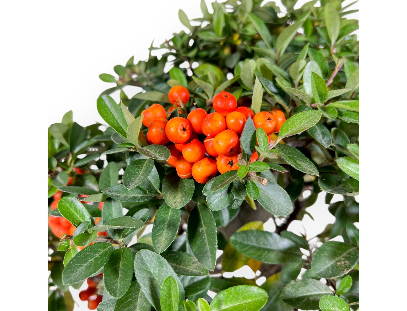 Este bonsái de Pyracantha perteneciente a la variedad frutal perenne es apreciado por su floración blanca primaveral y la producción de bayas de color naranja vivo en otoño-invierno. El tronco sólido y la copa armoniosa realzan la planta y resaltan su belleza general. Cultivada en una maceta rectangular de gres esmaltado verde, crea un equilibrio cromático que resalta el intenso follaje verde y las bayas naranjas.