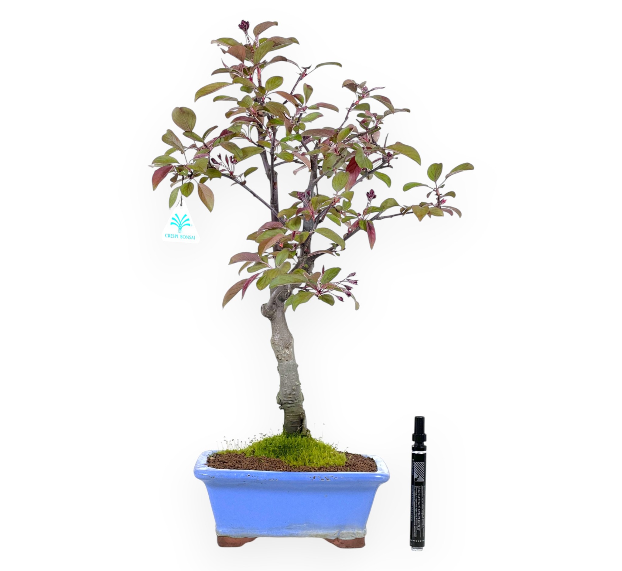 Bonsái de Malus diable rouge (manzano), variedad frutal caducifolia, es apreciado por su floración primaveral de color blanco rosado y su posterior producción de pequeñas manzanas, que pasan del amarillo verdoso al rojo al madurar, dando carácter al árbol. El follaje se vuelve amarillo anaranjado en otoño y se deshoja en invierno. El maceta rectangular de gres esmaltado azul claro contrasta elegantemente con los colores del follaje y los frutos.