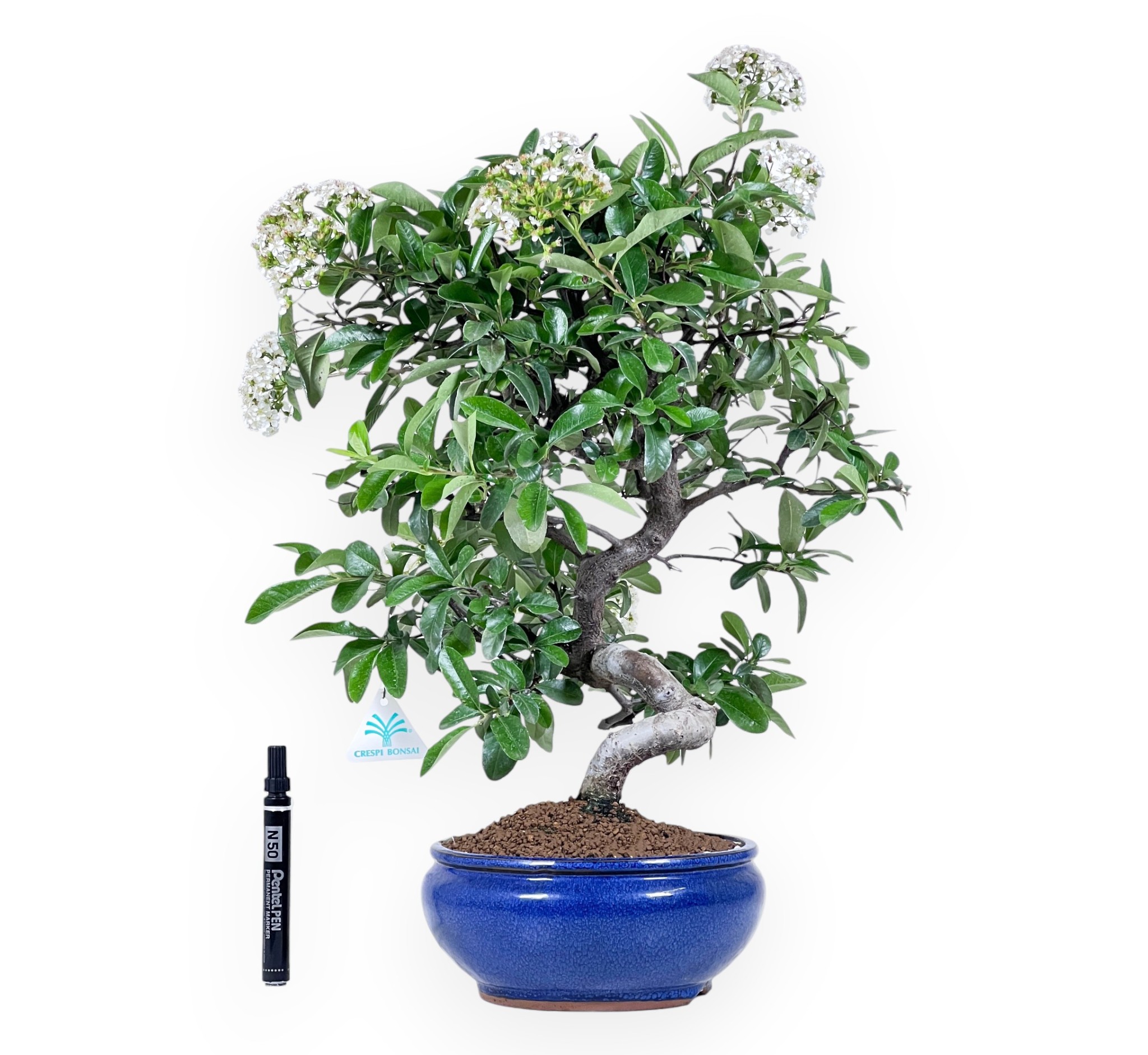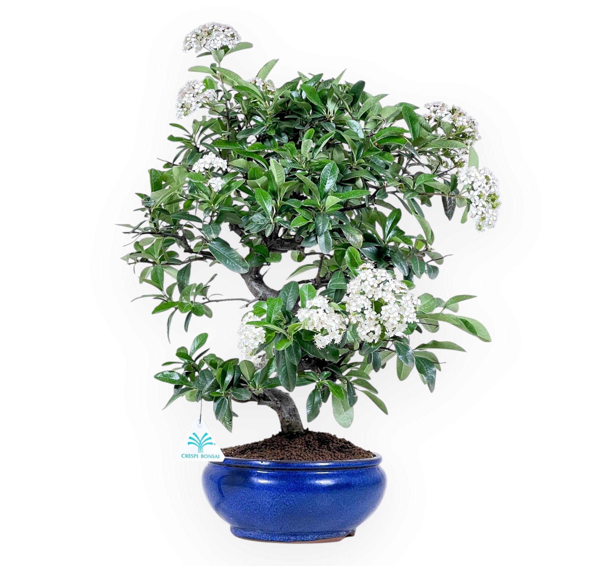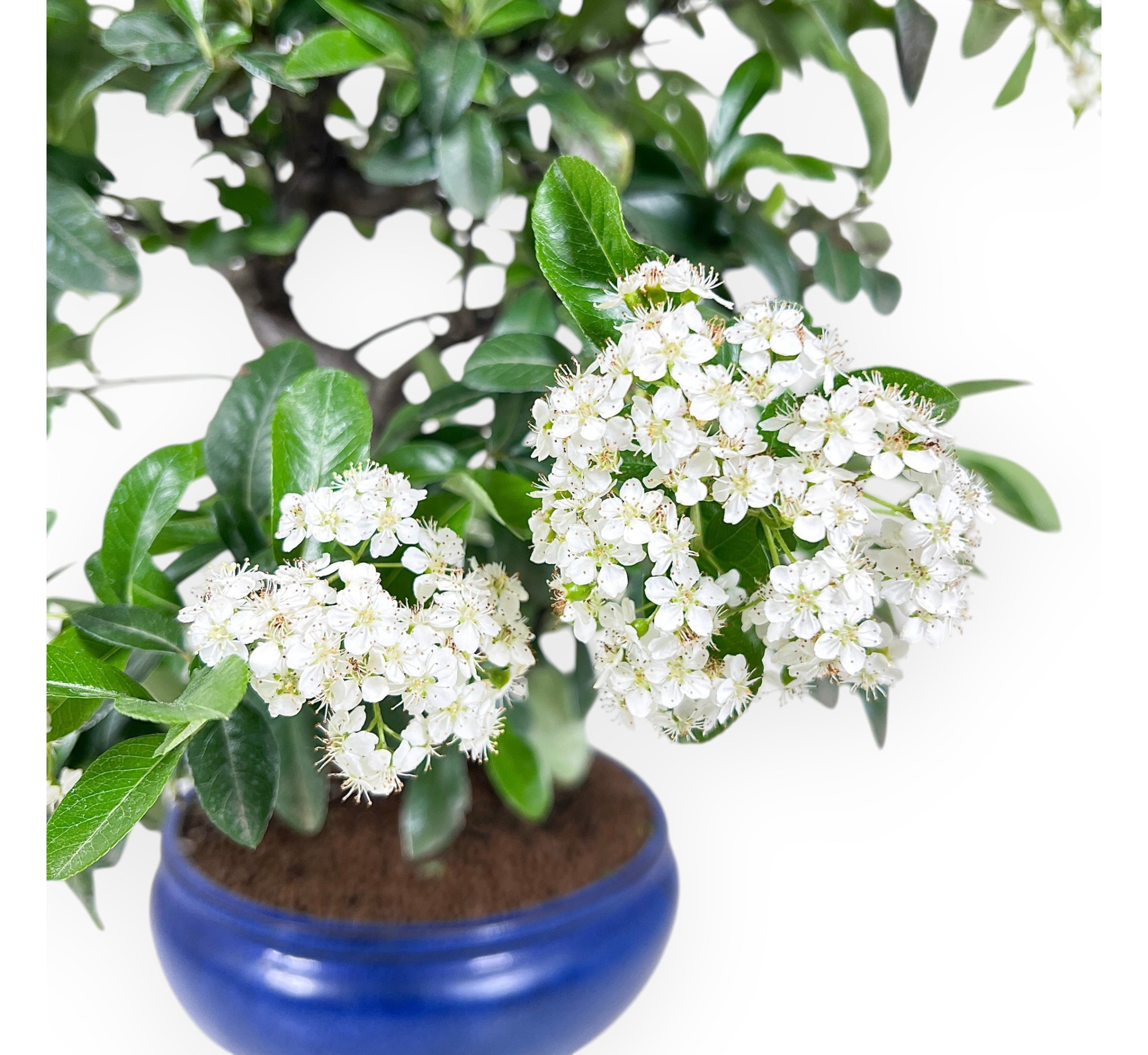 Bonsái de Pyracantha, especie frutal de hoja perenne, apreciado por su floración blanca en primavera y la producción de bayas de color naranja brillante en otoño-invierno. La copa armoniosa realza la planta y resaltan su belleza general. Cultivado en un maceta redondo de gres esmaltado azul, crean un contraste refinado con el verde brillante del follaje, realzando al mismo tiempo la delicadeza de las flores blancas y, en la época de fructificación, la vivacidad de las bayas de colores.