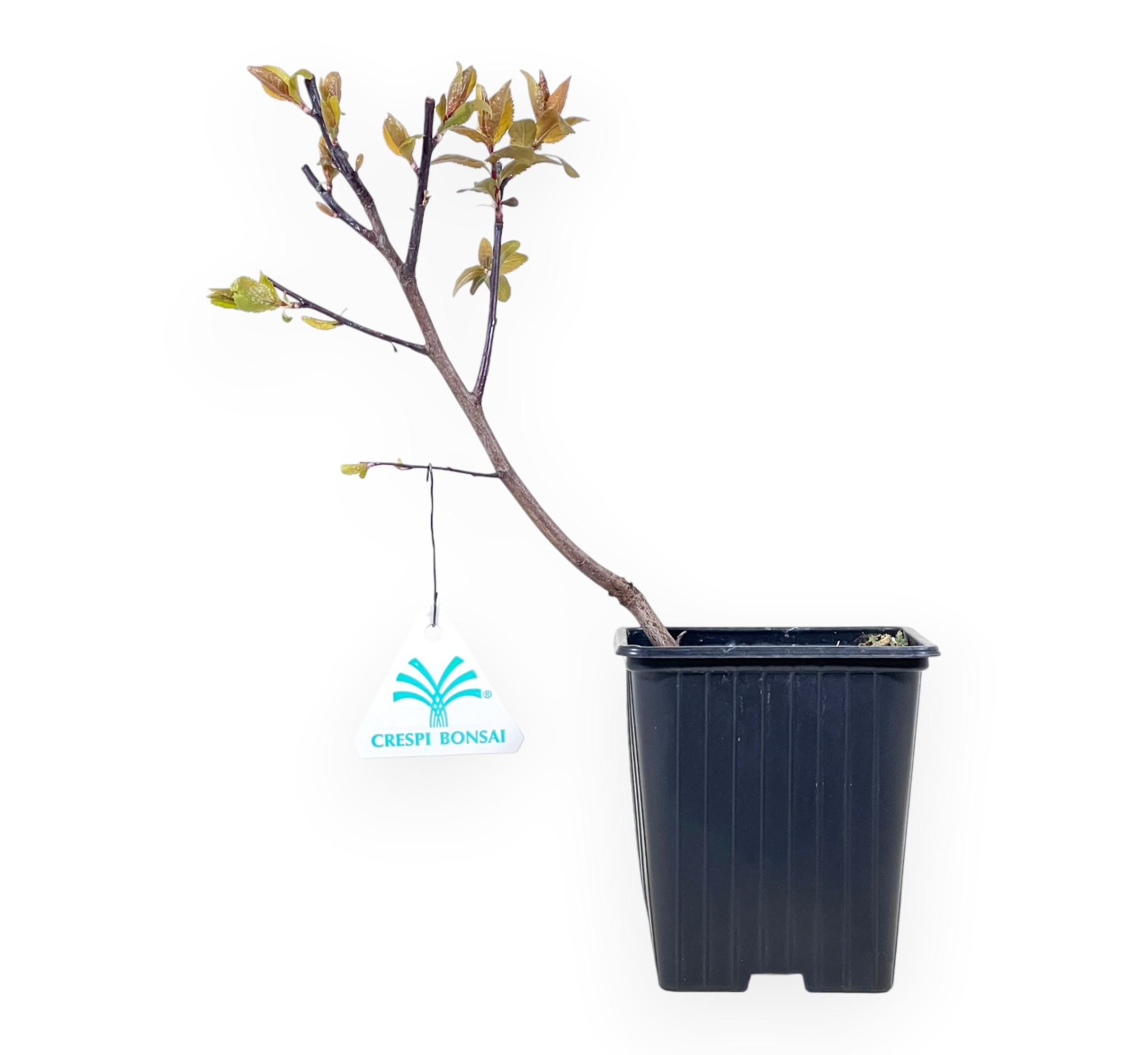 Planta de trabajo de Prunus Cerasifera choco creme caracterizada por una altura sin maceta de 16,5 cm y un tamaño del tronco de 0,7 cm. La planta se cultiva en una maceta cuadrada de plástico cuyas dimensiones son 9x9xH9,5 cm.